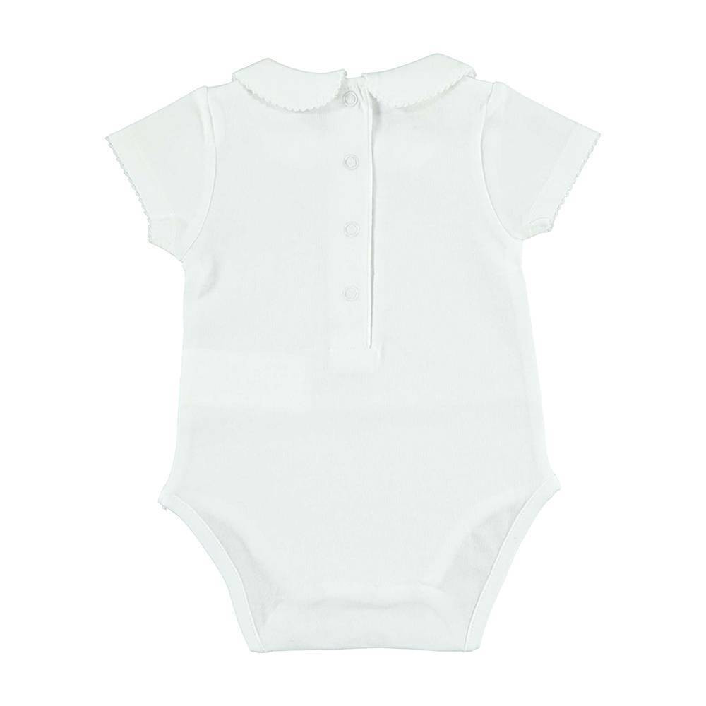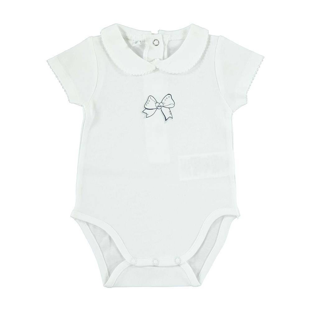Трикотажный боди с коротким рукавом из 100% хлопка декорирован воротничком и горным хрусталиком в виде бантика спереди. Застегивается кнопками на спинке, а кнопки между ножками для удобства смены подгузника.