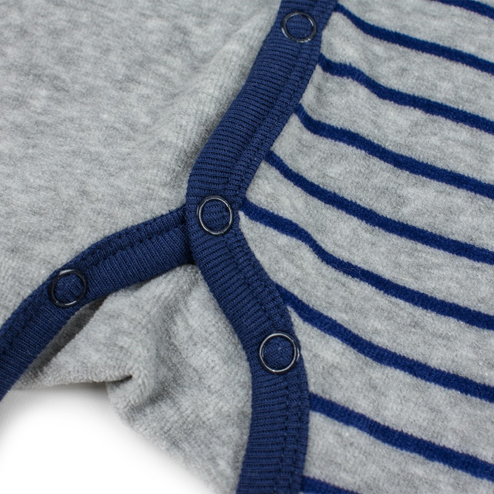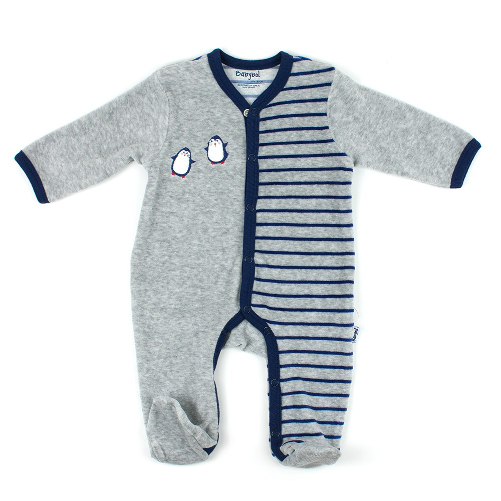 Трикотажный велюровый комбинезон-человечек Babybol для новорожденного мальчика наполовину полосатый застегивается спереди на кнопки по всей длине, что существенно облегчает и ускоряет процесс одевания, кнопки между ножками – для удобства смены подгузника. Горловина, низ рукава обработаны контрастной трикотажной бейкой для предотвращения растягивания. Комбинезон украшает веселая аппликация пингвинов.