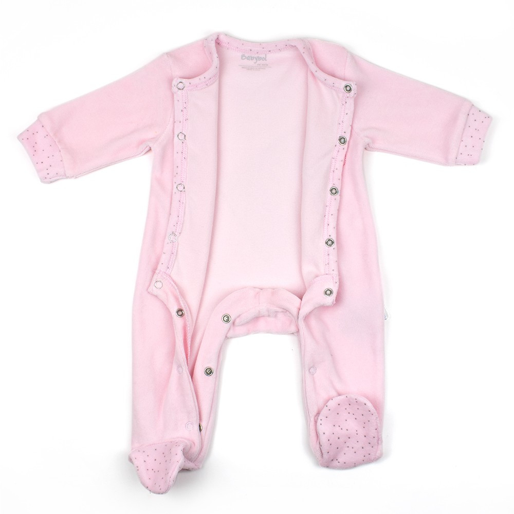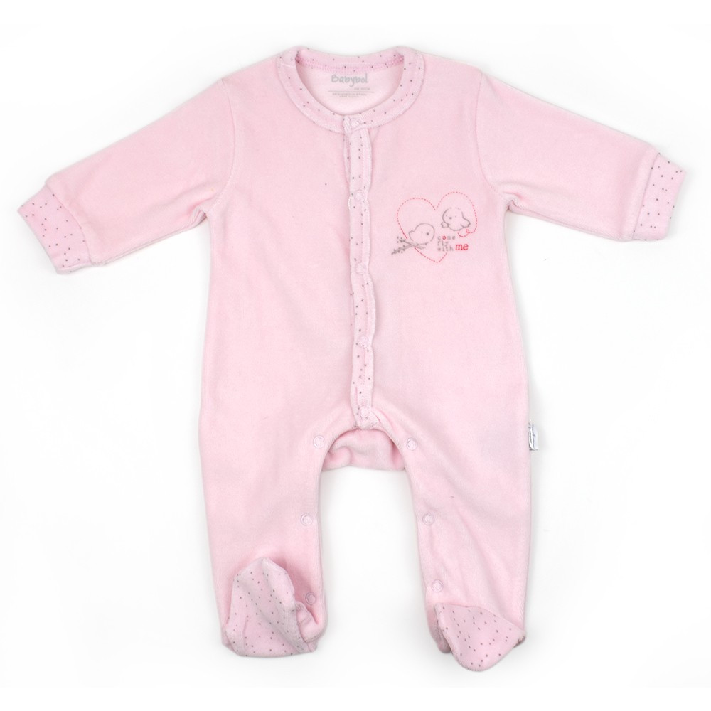 Велюровый однотонный нежно-розовый человечек Babybol для новорожденной девочки прекрасно подходит и для выписки, и для сна дома. Манжеты на рукавах, горловина человечека, стопы - цветные. Спереди украшен очень милым рисунком. Модель застегивается на кнопки спереди по всей длине, что существенно облегчает одевание малышки. Кнопки между ножками для удобства смены подгузника.