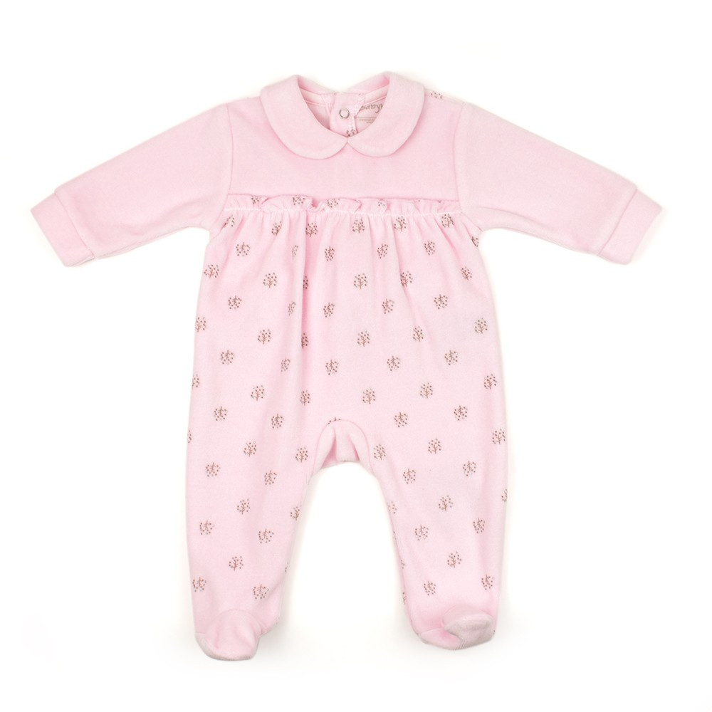 Велюровый цветной нежно-розовый человечек Babybol для новорожденной девочки прекрасно подходит и для выписки, и для сна дома. Манжеты на рукавах, воротник человечека однотонные. Украшает модель маленький тоненький рюш и стразы. Комбинезон застегивается кнопками на спинке.
