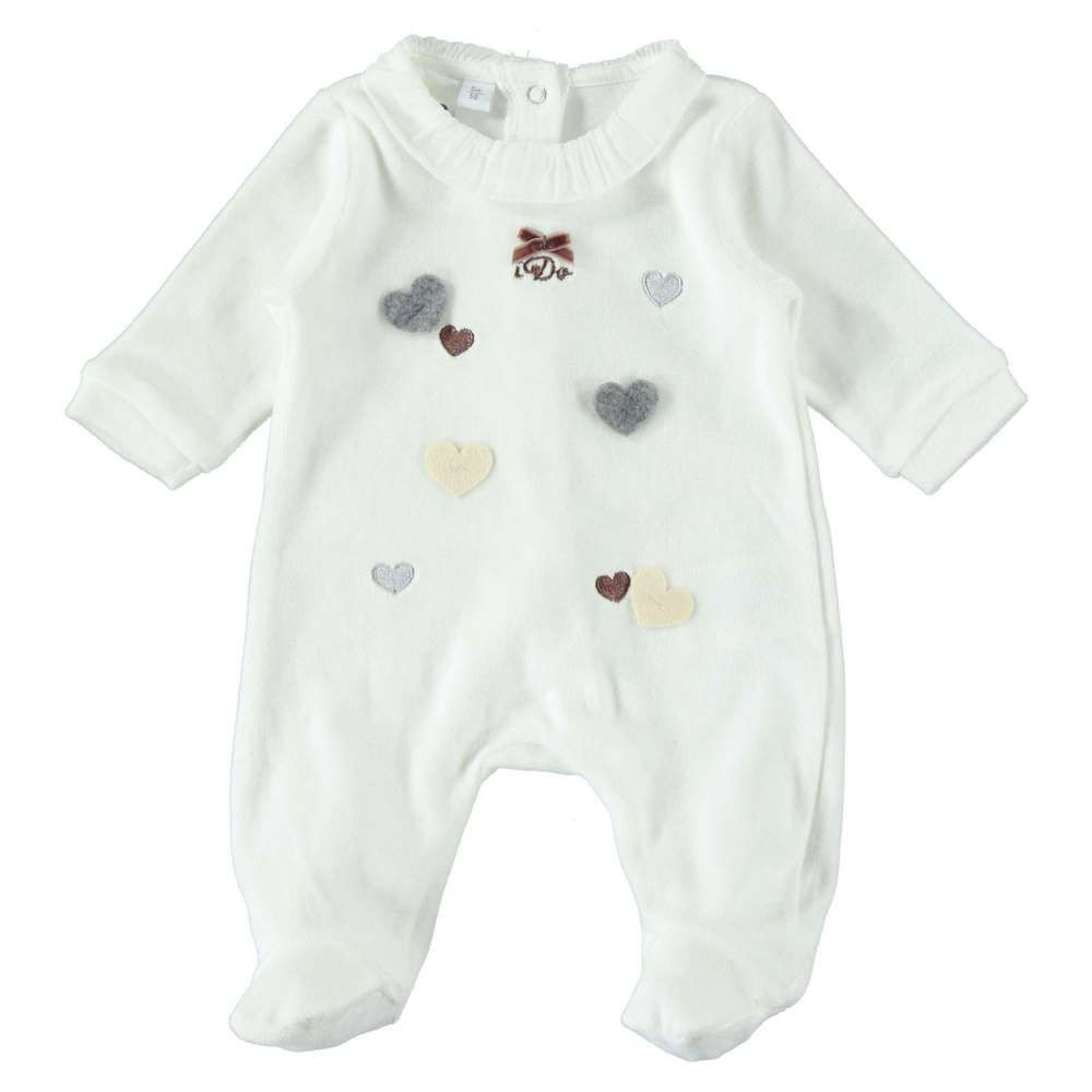 Восхитительный велюровый комбинезон безусловно понравится Вам и Вашему ребенку. Перед украшают и аппликация из цветных сердечек и рюш вокруг горловины. Застежка расположена на спинке- кнопки по всей длине.
