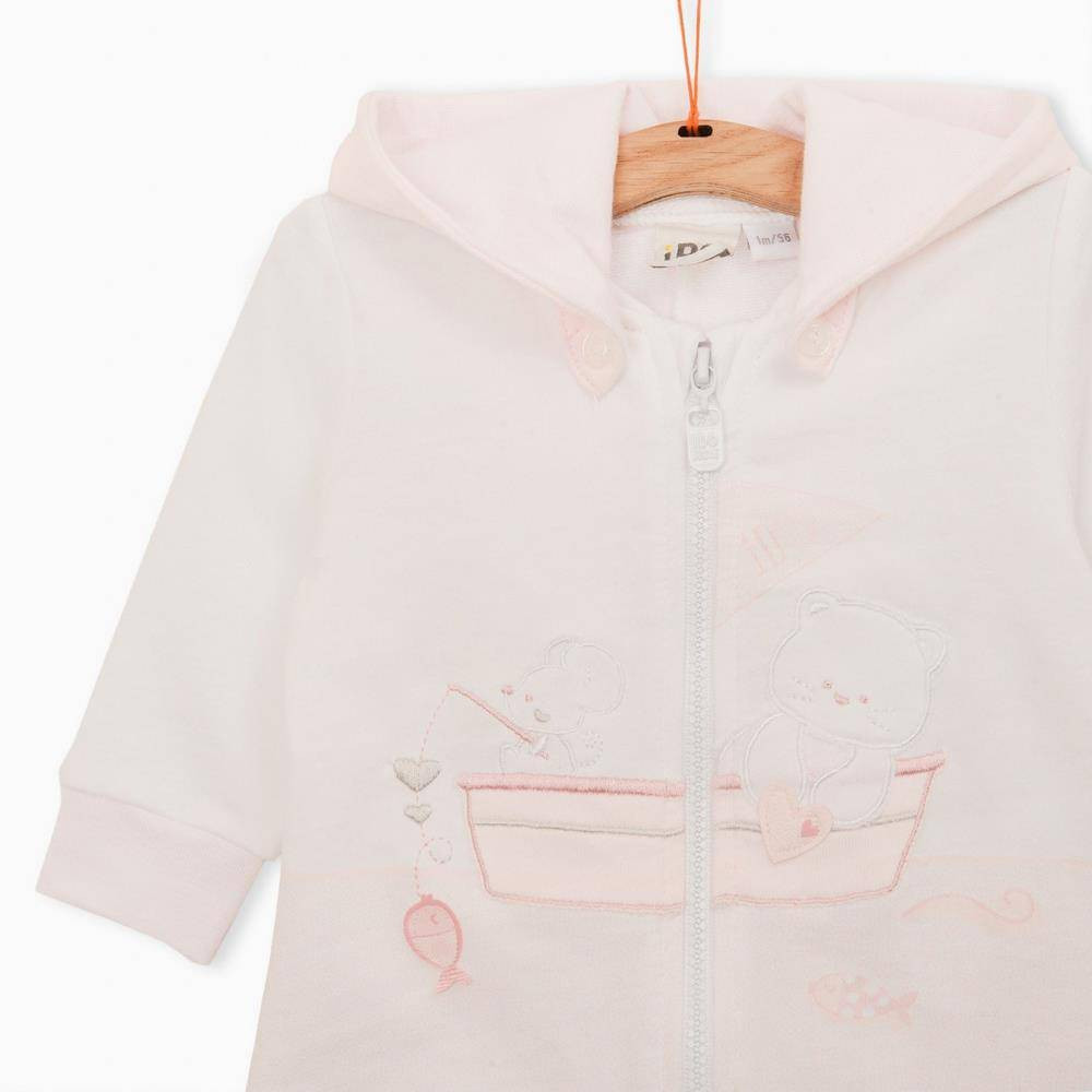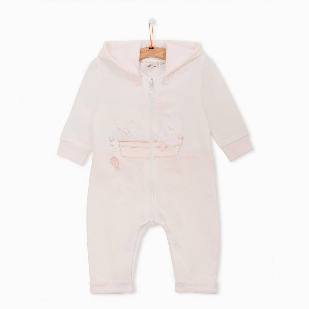 Удобный, стильный трикотажный детский комбинезон прекрасный вариант для прогулки. Капюшон съемный, застегивается спереди на молнию. Украшает его аппликация по центру. Комбинезон без носочков, потому будете носить его дольше, не привязаны к росту быстрорастущего малыша.