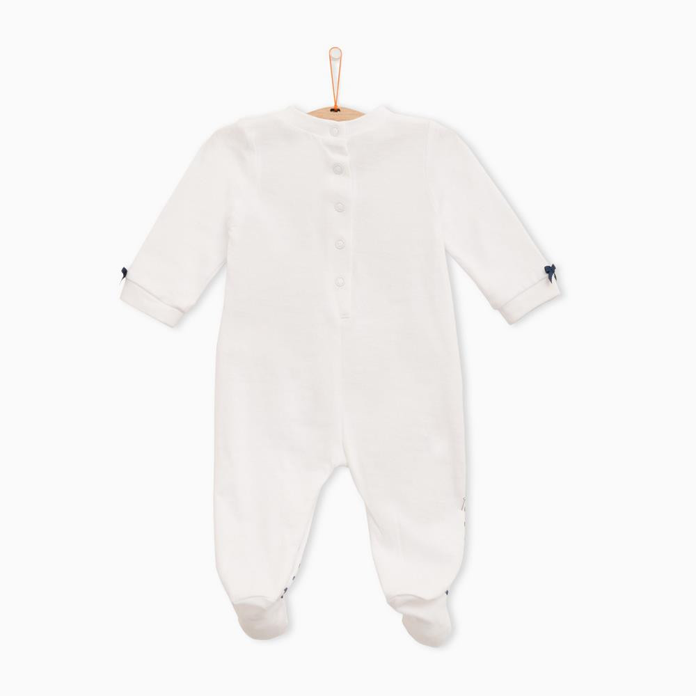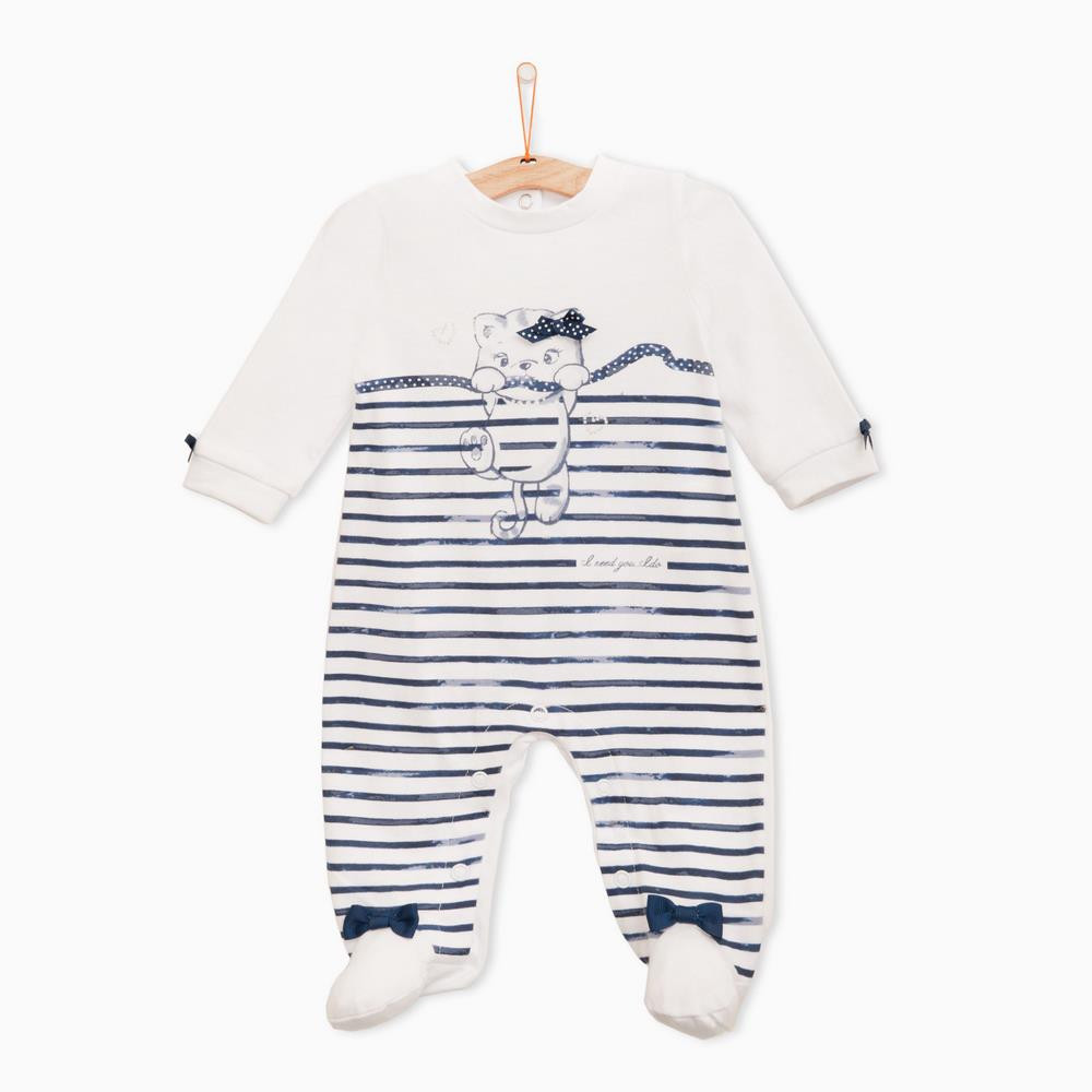 Невероятно милый и уютный комбинезончик для Вашей любимой малышки. Этот красивый и легкий комбинезон выполнен в стильном сочетании белого цвета в основе и темно-синей полоски. Впереди украшен симпатичным рисунком в виде котенка, а также красивыми темно-синими бантиками на рукавах и ножках. Комбинезон очень удобно застегивается на кнопки сзади и на ножках, что очень облегчит переодевание ребенка и смену подгузника. Изготовленный из натуральной 100% хлопковой ткани, этот комбинезончик будет идеальным приобретением для гардероба вашей малышки на весну и лето.