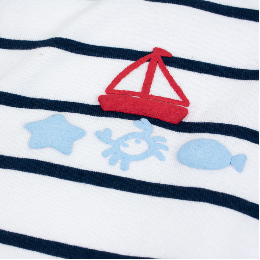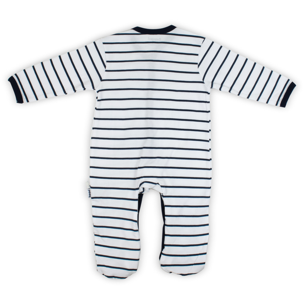 Трикотажный полосатый комбинезон-человечек Babybol для новорождённого застегивается спереди на кнопки по всей длине, что существенно облегчает и ускоряет процесс одевания, кнопки между ножками – для удобства смены подгузника. Горловина, края человечка, низ рукава обработаны контрастной трикотажной резинкой для предотвращения растягивания. Комбинезон украшает веселая морская тема- корабль, крабы, кит, звезды.