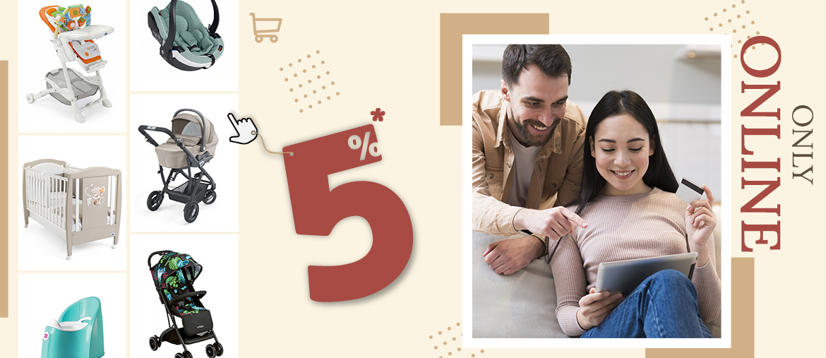 Только при заказе online действует скидка -5% на коляски, автокресла, кроватки, манежи, стульчики для кормления, ванночки, горшки.
