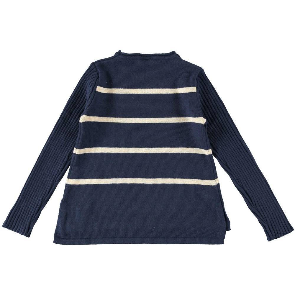 Трикотажный хлопковый вязаный свитер іDO прекрасное дополнение в гардеробе Вашей девочки. Свитер слегка расклешен к низу, по бокам есть не большие разрезы, украшают контрастные полоски и рукава связанные резинкой 2*2.