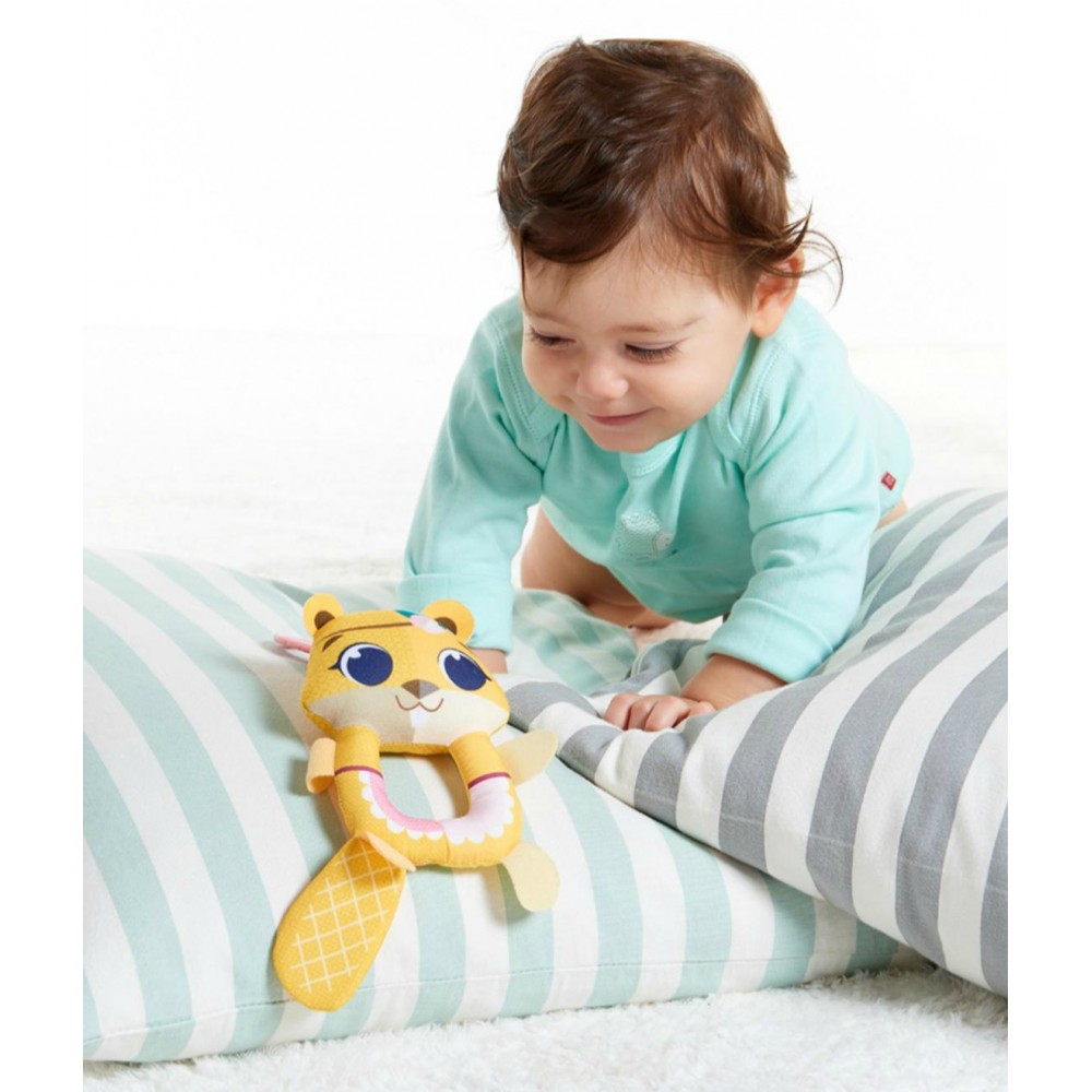 Удобное крепление колечко подойдет для подвешивания игрушки на кроватку, коврик, манеж, коляску или автокресло.