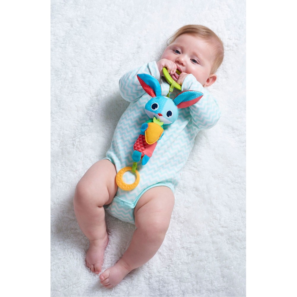 Подвеска Tiny Love Зайчик Томас — этот зайчик-колокольчик спрятал в себе приятный звон ветряного колокольчика. Звук не режет ухо, мягко и нежно убаюкивает деток.С помощью такой игрушки малыш получает первое представление о цвете, мелодии, форме, материале. Развиваются тактильные ощущения, в игрушке используются разные на ощупь материалы. Внизу зайчик спрятал оранжевое колечко — его можно погрызть и почесать об него десенки, тем самым облегчить период прорезывания зубиков.Расцветка зайчика очень приятная: мягкие тона бирюзового, розового и оранжевого делают эту игрушку невероятно стильной.