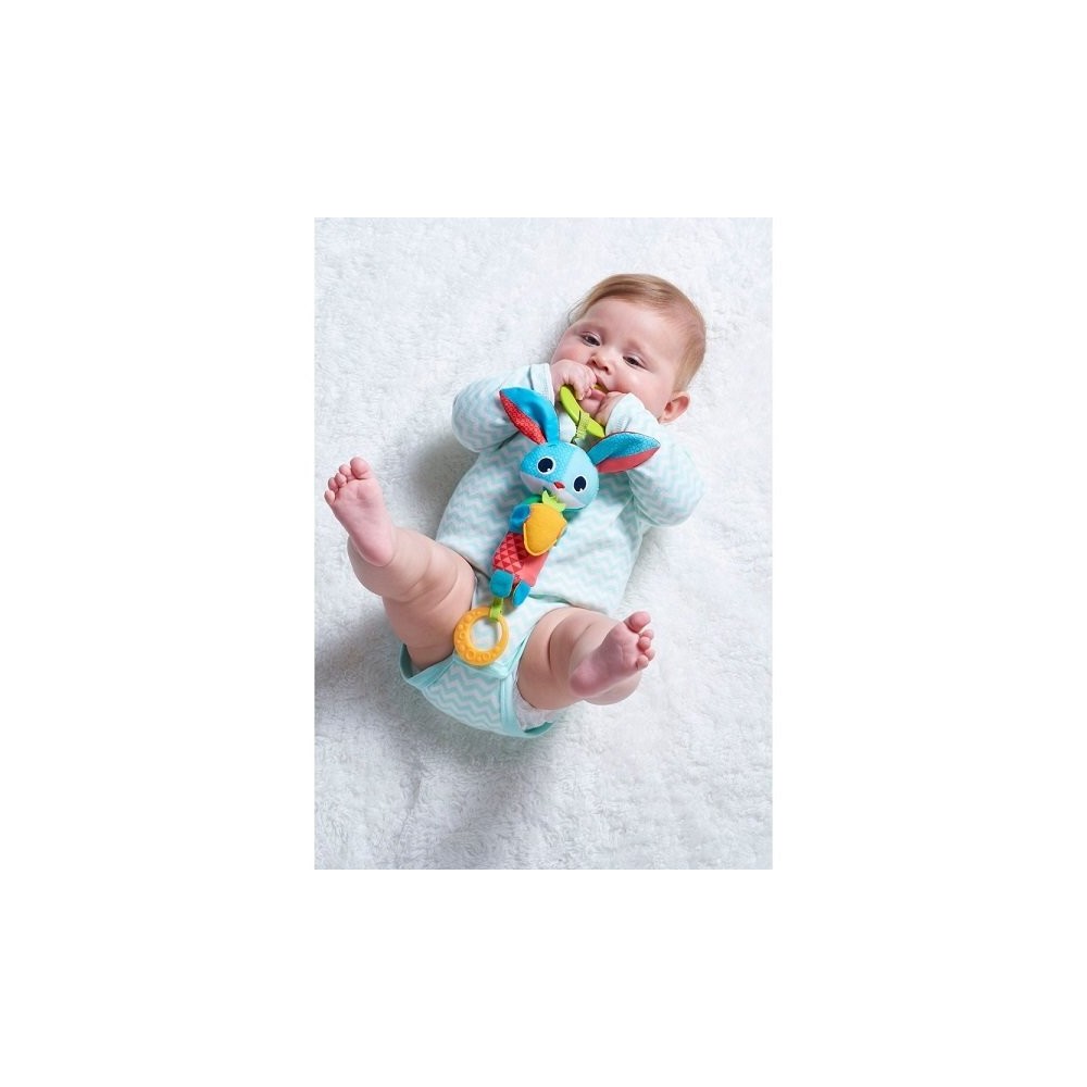 В лапках зайки малыш найдет мягкую, оранжевую морковку, внутри которой сделано специальное отверстие, чтоб кроха мог легко ухватиться и попробовать ее. Прорезиненный грызунок поможет вашему ребенку почесать десна, а также сделать массаж пальчиков, ощупываю выпуклые линии сбоку.Самая любимая для малышей часть игрушки — это ушки. Детки обожают мять и крутить их. Цветные ушки хрустят!На спинке и голове у зайчика есть мягкая шерстка. Ее очень приятно гладить и сравнивать с другими материалами на туловище. Малыш с удовольствием будет рассматривать различные рисунки на тельце и мордочке зайчика, которые создают интересный визуальный эффект. Можно увидеть разные фигуры и цветы.