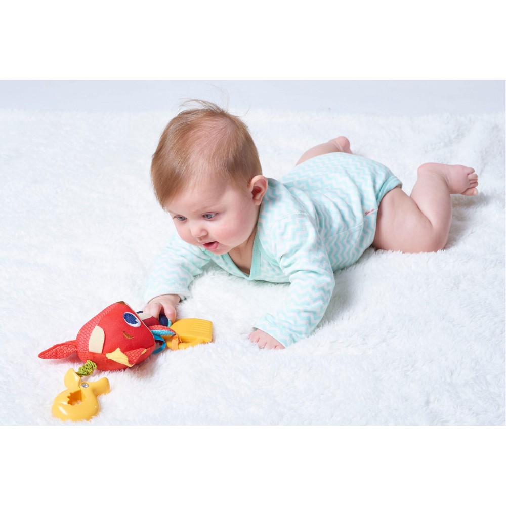 В лапках у мишки есть рыбка-грызун. С его помощь можно почесать десна и сделать массаж пальчикам. На рыбке маленькие выпуклые точки, трогая которые, ребенок будет расслаблять ручки и подушечки пальцев.