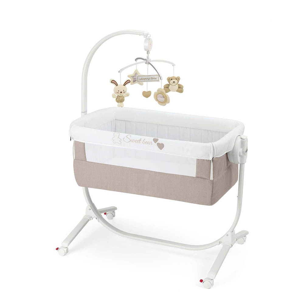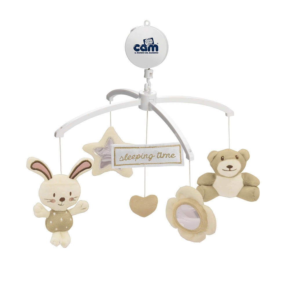 Мобиль на кроватку Cam состоит из небольшой музыкальной шкатулки и карусели с закрепленными на ней мягкими игрушками.