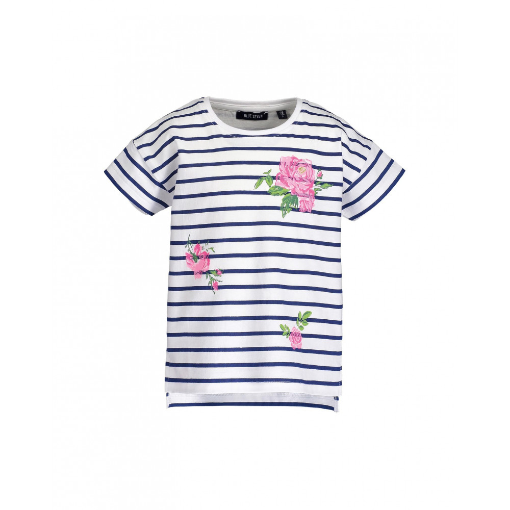 Замечательная трикотажная полосатая футболка для девочки изготовлена из 100% хлопка. Футболку украшают аппликация роз по всему полю. Спинка длиннее переда. Размер футболки - рост Вашего ребенка.