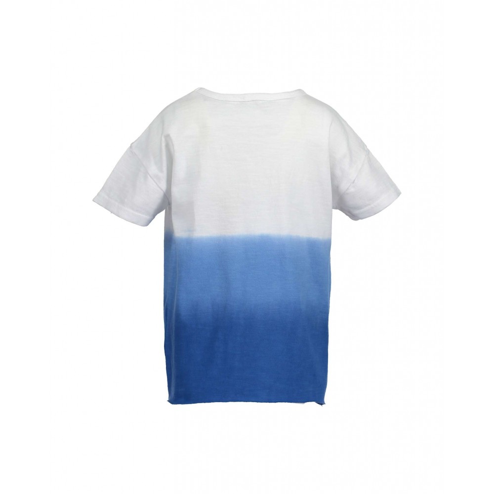 Оригинальная трикотажная футболка для мальчика спереди украшена принтом. Цветовая гамма снизу синяя и постепенно переходит в белый цвет. Размер изделия определяется ростом Вашего ребенка.