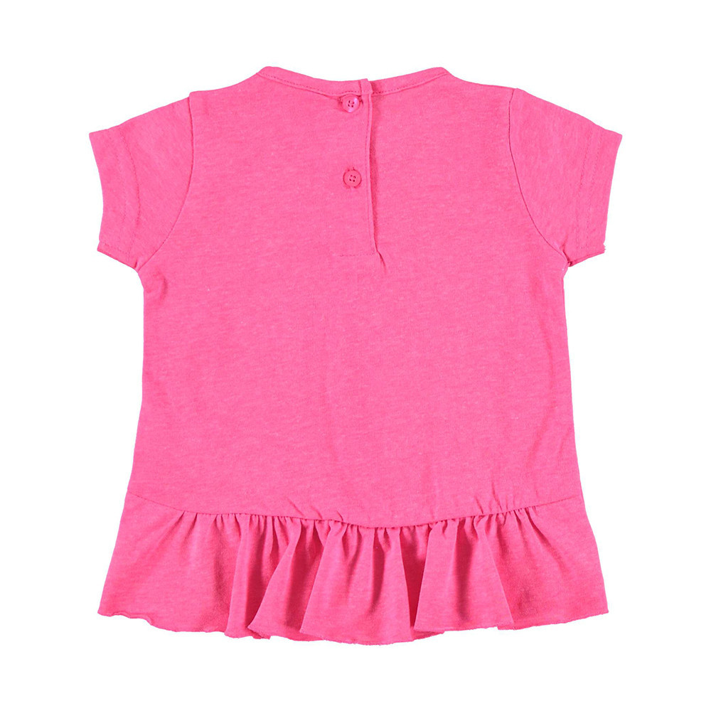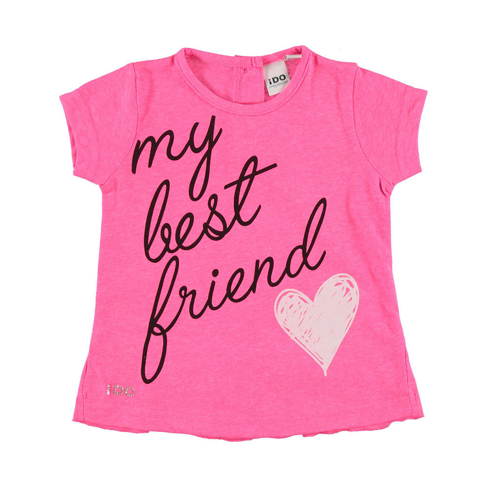 Замечательная легкая трикотажная футболка iDO изготовлена из полиестера и хлопка. По центру перед декорирована печатным принтом и рисунком сердца. На спинке оборки, застежка - пуговицы. Футболка очень красива и не останется без Вашего внимания.
