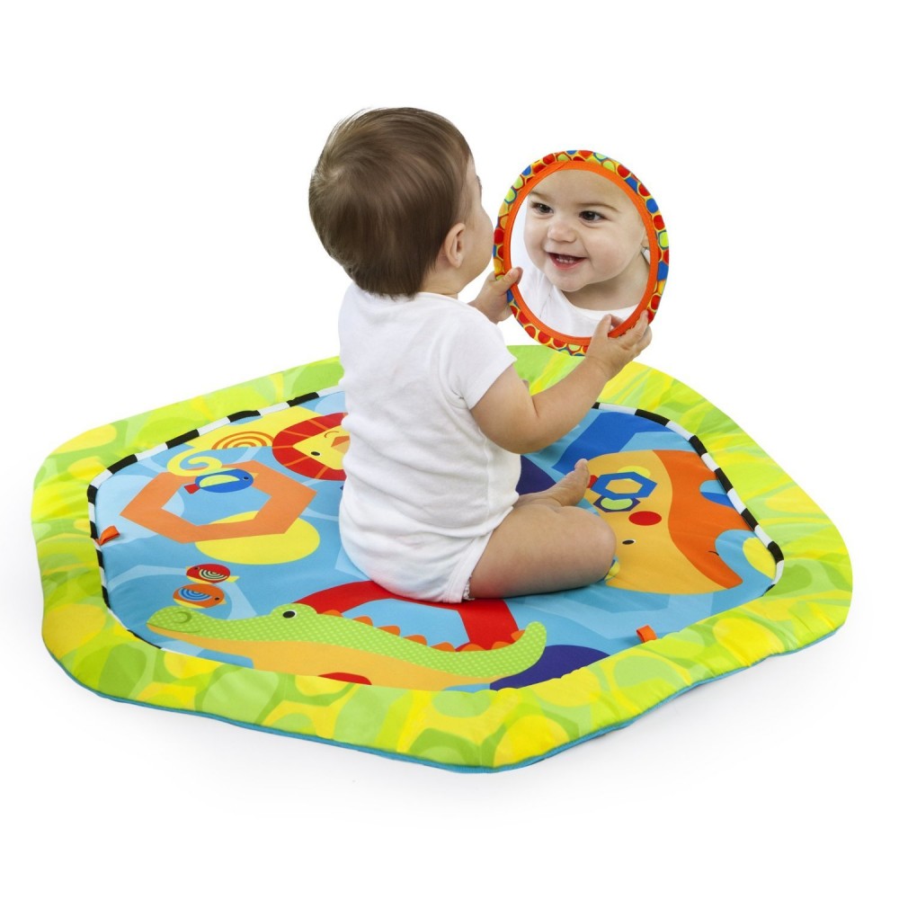 При ударе по подвесной игрушке-львенку будет слышен звук погремушки, который поднимет ребенку настроение. Каждый малыш сможет еще больше познать себя, благодаря специальному безопасному зеркальцу, которое удобно расположено вверху коврика. Яркие и веселые погремушки развеселят малыша и привлекут его внимание.