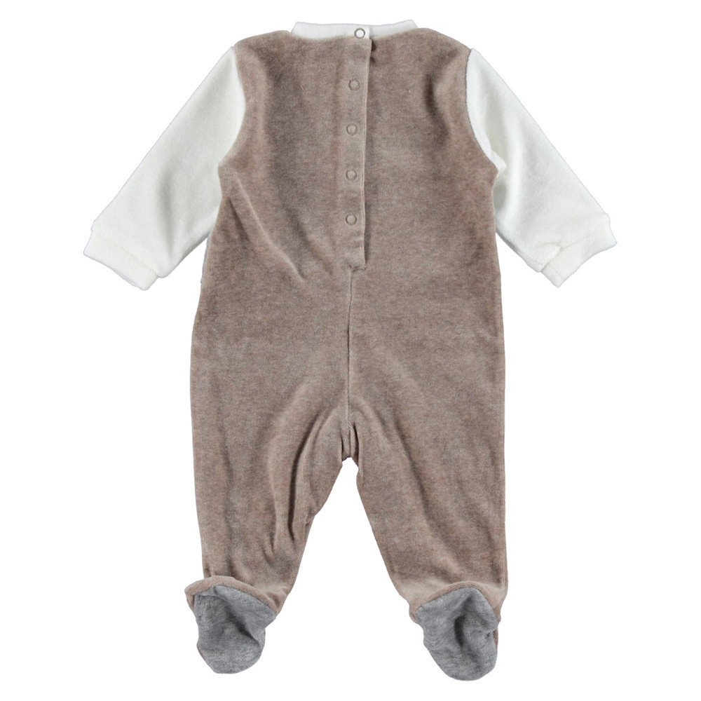 Восхитительный велюровый комбинезон безусловно понравится Вам и Вашему малышу. Перед украшает аппликация. Застежка расположена на спинке. Есть кнопки между ножек, что ускорит и облегчит смену подгузника.