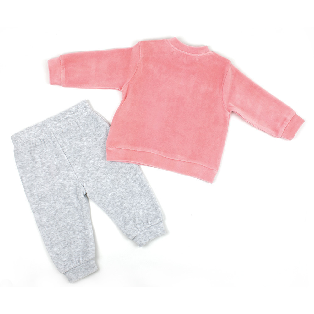 Трикотажный велюровый комплект Babybol для новорождённой девочки состоит из реглана и штанишек. Реглан спереди украшен веселым детским принтом, на плече есть кнопки, для легкого и быстрого одевания. Низ штанишек на манжетах, пояс на талии на резинке.