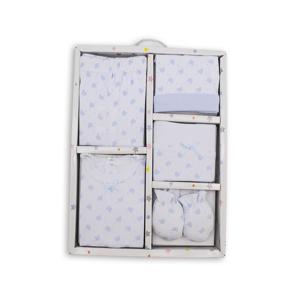 Замечательный трикотажный комплект для новорожденного малыша изготовлен из 100% хлопка. Ползунок на резинке довольно свободный и не сковывает движения малыша, шапочка с отворотом, свитер застегивается на спинке кнопками, слюнявчик на липучке, царапки на тоненькой резинке. Трикотажное полотно с веселым детским принтом. Комплект упакован в подарочную коробку.