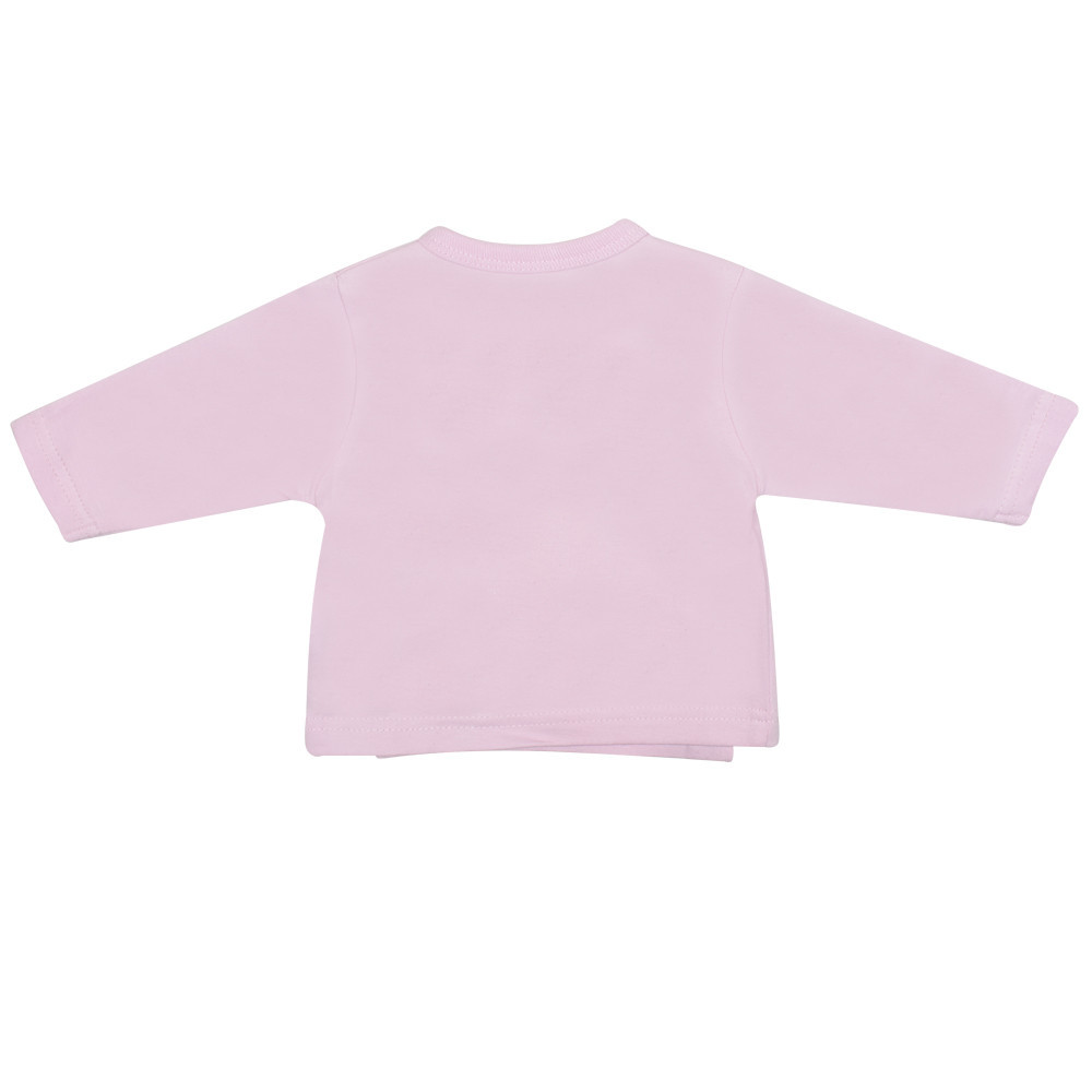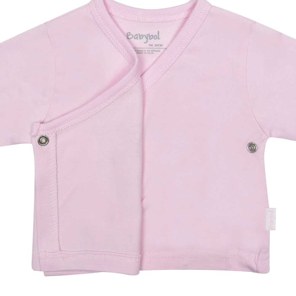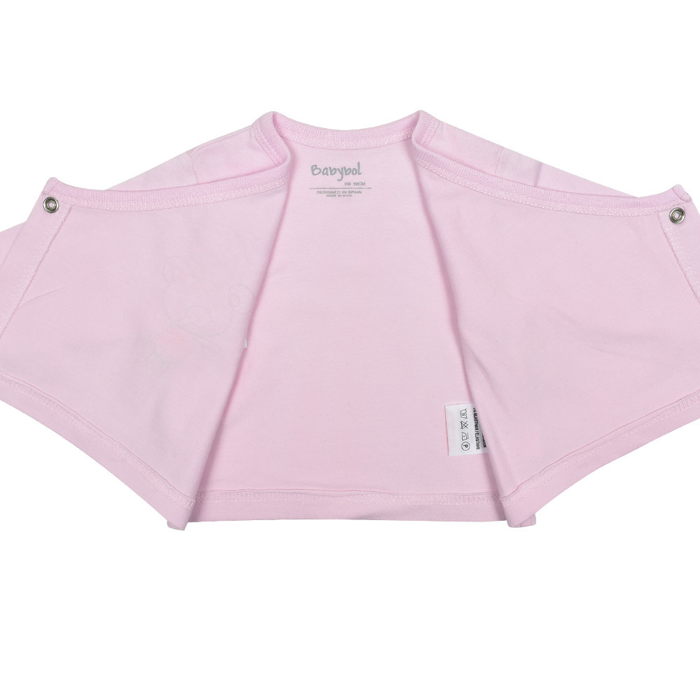 Замечательное и практичное предложения для малышки - трикотажный комплект Babybol изготовленный из хлопка состоит из распашонки и ползунка. Однотонная распашонка с V образным вырезом застегивается на боку кнопкой и украшена милым детским принтом. Ползунки розовый меланж на широком однотонном трикотажном поясе не будет давить на животик малышки.