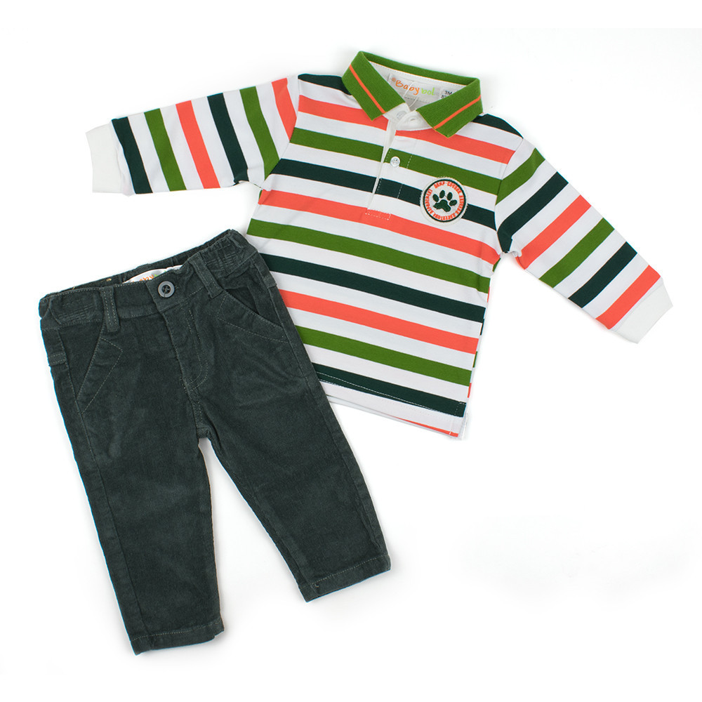 Замечательный стильный комплект Babybol состоит из реглана поло и вельветовых брюк непременно понравится Вашему ребенку. Яркий полосатый реглан поло с однотонными манжетами, аппликацией, небольшими разрезами по бокам выглядит модно и стильно. Застегивается реглан на пуговицы. Мягкие вельветовые брюки пополнят гардероб Вашего ребенка. Объем талии в брюках регулируется вшитой в поясе резинкой, которая затягивается, и застегивается на внутренние пуговицы.