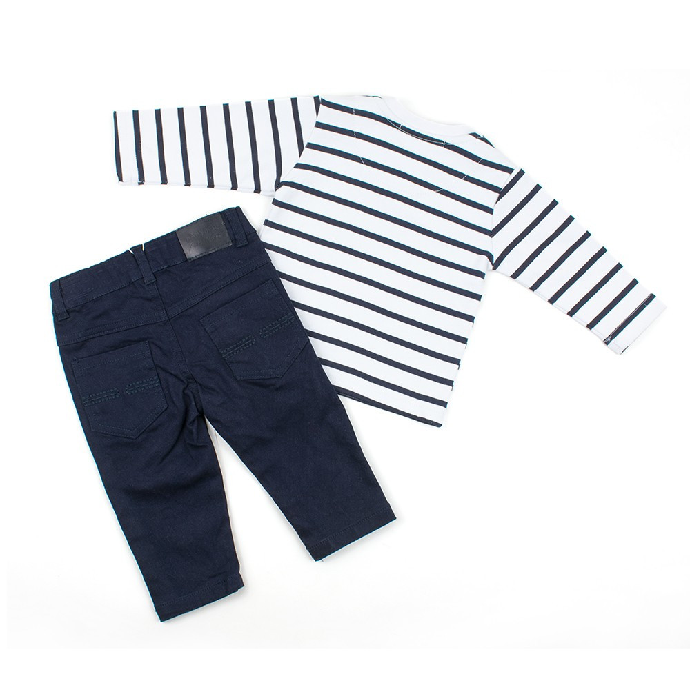 Стильный комплект Babybol состоит из реглана и брюк он непременно понравится Вашему ребенку. Яркий полосатый реглан украшает детский веселый рисунок. Застегивается реглан на плече на пуговицы в размерах 12м, 18м, 24м. Классические брюки пополнят гардероб Вашего ребенка. Объем талии в брюках регулируется вшитой в поясе резинкой, которая затягивается, и застегивается на внутренние пуговицы. В этом ансамбле Ваш ребенок всегда будет выглядеть модно и стильно.