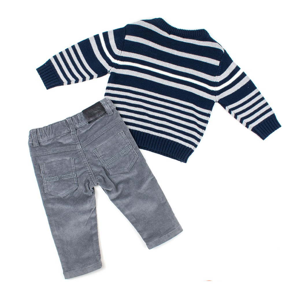 Замечательный стильный комплект Babybol состоящий из свитера и брюк понравится Вам и Вашему ребенку. Свитер вязанный с полосками разной ширины, снизу пришита эмблема. Брюки вельветовые, пояс на талии регулируется вшитой резинкой, которая затягивается, и застегивается на внутренние пуговицы. В этом ансамбле Ваш ребенок всегда будет выглядеть модно и стильно.
