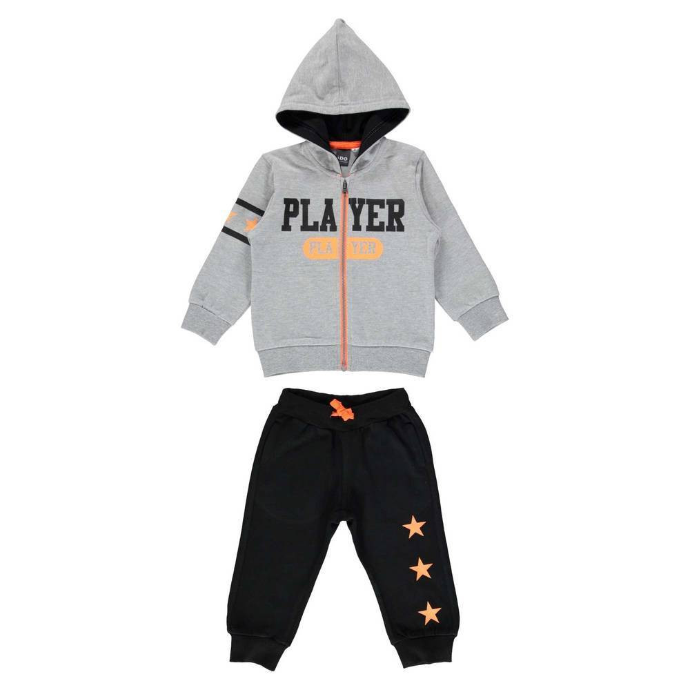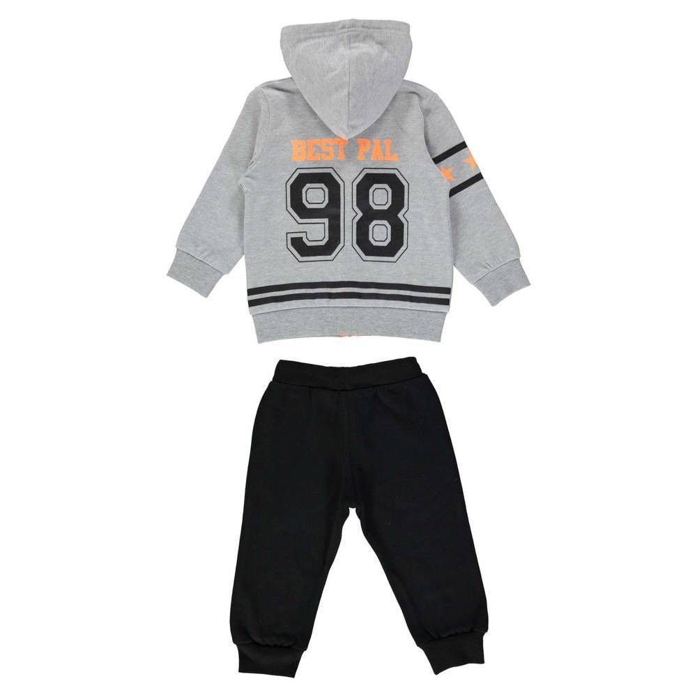 Замечательный трикотажный детский комплект для мальчика состоит из толстовки и штанов. Толстовка на молнии с капюшоном украшен принтом спереди и на рукаве. Штаны на манжете, пояс на трикотажной резинке со шнурком, позволяющим регулировать объем талии. Штанину украшает печатный принт, и боковой карман.