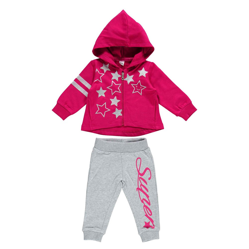 Спортивный трикотажный костюм из стрейч-хлопка состоит из расклешенной толстовки с капюшоном и на застежке молнии и штанишек. карманы в боковом шве, спинка длиннее перед. Трикотажная двойная резинка на рукавах, косточках, а на талии штанишек есть еще и внутренний шнурок, регулирующий ее объем. Левая штанина украшена контрастным печатным текстом: "супер" в цвет толстовки.