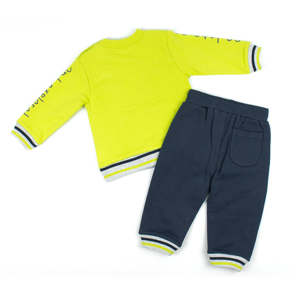Удобный, стильный спортивный комплект Babybol станет незаменимым вариантом для Вашего мальчугана для ежедневных прогулок в любую погоду. Комплект изготовлен из 100% хлопка с начесом внутри. Мягкие трикотажные штаны с боковыми вставками на манжете с прорезными карманами спереди, на эластичном поясе с вшитой резинкой, резинка с тесьмой, которая затягивается, позволяет регулировать объем талии. Манжеты на лодыжках из полосатой трикотажной эластичной резинки. Модель штанов практична. Горловина у реглана, манжеты на рукавах, пояс на талии на полосатой трикотажной эластичной резинке. Украшением служит карман-кенгуру и печатный текст по центру переда и на рукавах. Застегивается реглан на плече кнопками, только для размеров 12м, 18м, 24м, что облегчат и ускорят процесс одевания ребенка.