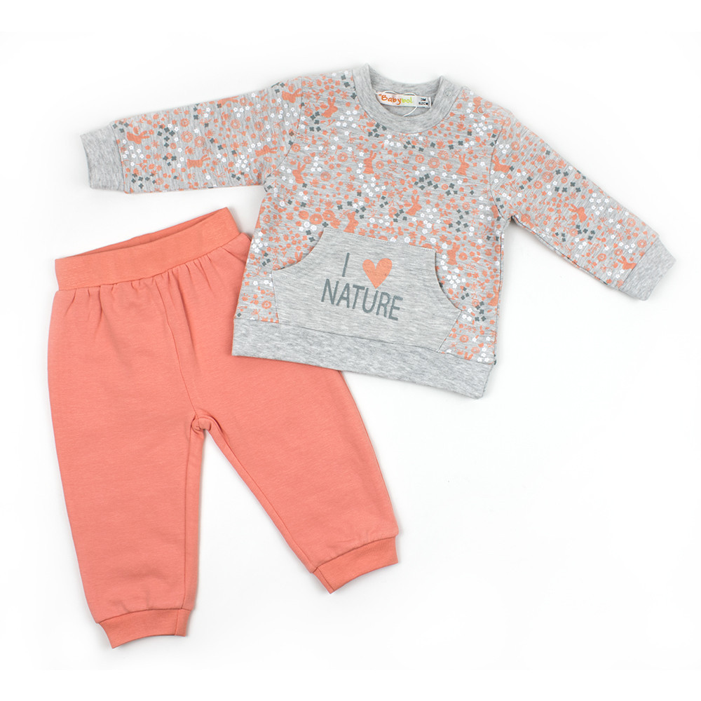 Замечательный стильный трикотажный комплект Babybol для девочки состоит из реглана и штанишек. Цветной реглан украшают однотонные манжеты на рукавах, пояс на талии, карман-кенгуру с печатным текстом. Застегивается реглан на плече на пуговицы для размеров 12м, 18м, 24м. Трикотажные брюки с резинкой в поясе и манжетами на лодыжках. В этом ансамбле Ваш ребенок всегда будет выглядеть модно и стильно.