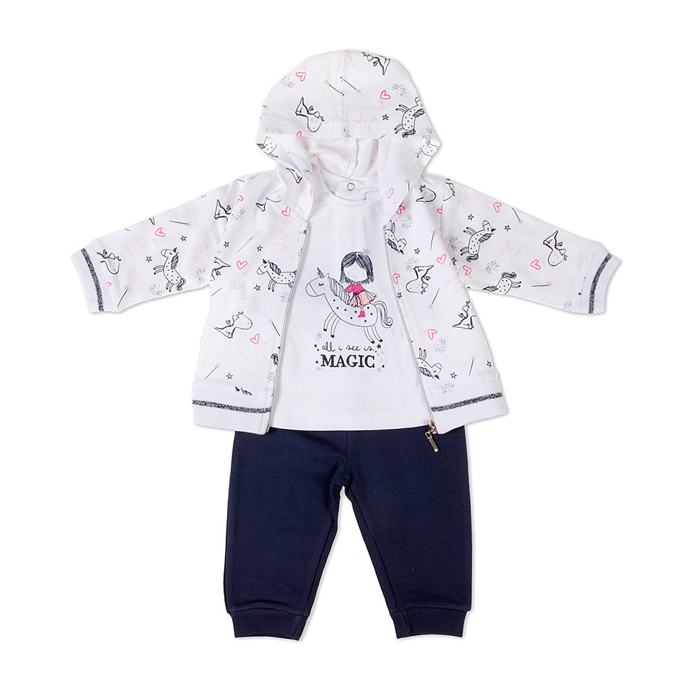 Удобный, модный, стильный трикотажный комплект Babybol станет незаменимым вариантом Вашей девочке для ежедневных прогулок. Мягкие трикотажные штаны на манжете с карманами в боковых швах, на эластичном поясе с вшитой резинкой, резинка с тесьмой, которая затягивается, позволяет регулировать объем талии.Толстовка с капюшоном, декорирована веселым детским принтом в виде лошадок, застегивается спереди на молнию. Рукава, пояс на талии трикотажная эластичная двойная резинка с цветной полоской в тон штанишек. Футболка украшена принтом девчушки на лошадке, застежка кнопки сзади только для размеров до 3 лет.