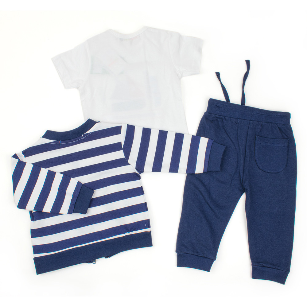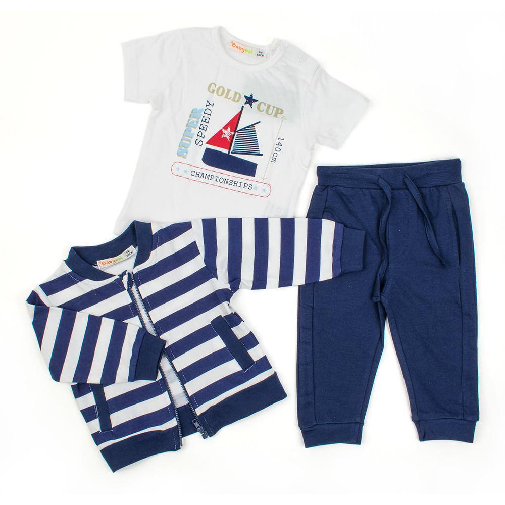 Удобный, модный, стильный трикотажный спортивный комплект Babybol необходим Вашему мальчугану для ежедневных прогулок. Полосатый свитер на молнии украшают и карманы, однотонные манжеты на рукавах и пояс на талии. Футболка украшена рисунком на морскую тематику, на плече есть кнопки, только для размеров до 3 лет, что облегчат и ускорят процесс одевания ребенка. Мягкие трикотажные штаны на манжете с прорезными боковыми карманами спереди, пояс с вшитой резинкой, резинка с тесьмой, которая затягивается, позволяет регулировать объем талии.