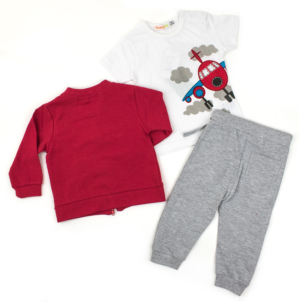 Удобный, модный, стильный трикотажный спортивный комплект Babybol необходим Вашему мальчугану для ежедневных прогулок. Толстовку на молнии украшает карман кенгуру, контрастный печатный принт. Футболка украшена рисунком на воздушную тематику, на плече есть кнопки, только для размеров до 3 лет, что облегчат и ускорят процесс одевания ребенка. Мягкие трикотажные штаны на манжете с прорезными боковыми карманами спереди, пояс с вшитой резинкой, резинка с тесьмой, которая затягивается, позволяет регулировать объем талии.