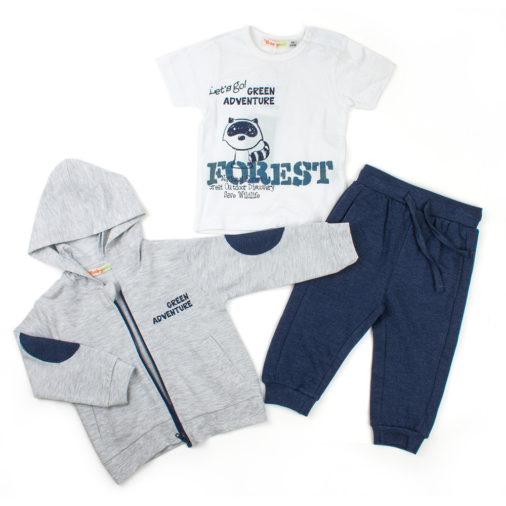 Практичный, модный, стильный трикотажный спортивный комплект Babybol необходим Вашему мальчугану для ежедневных прогулок. Толстовка с капюшоном застегивается на молнию, украшена печатным принтом, налокотники на рукавах одного цвета со штанами. Футболка украшена детским рисунком, на плече есть кнопки, только для размеров до 3 лет, что облегчат и ускорят процесс одевания ребенка. Мягкие трикотажные штаны на манжете с прорезными боковыми карманами спереди, пояс с вшитой резинкой, резинка с тесьмой, которая затягивается, позволяет регулировать объем талии.