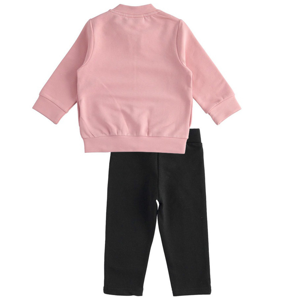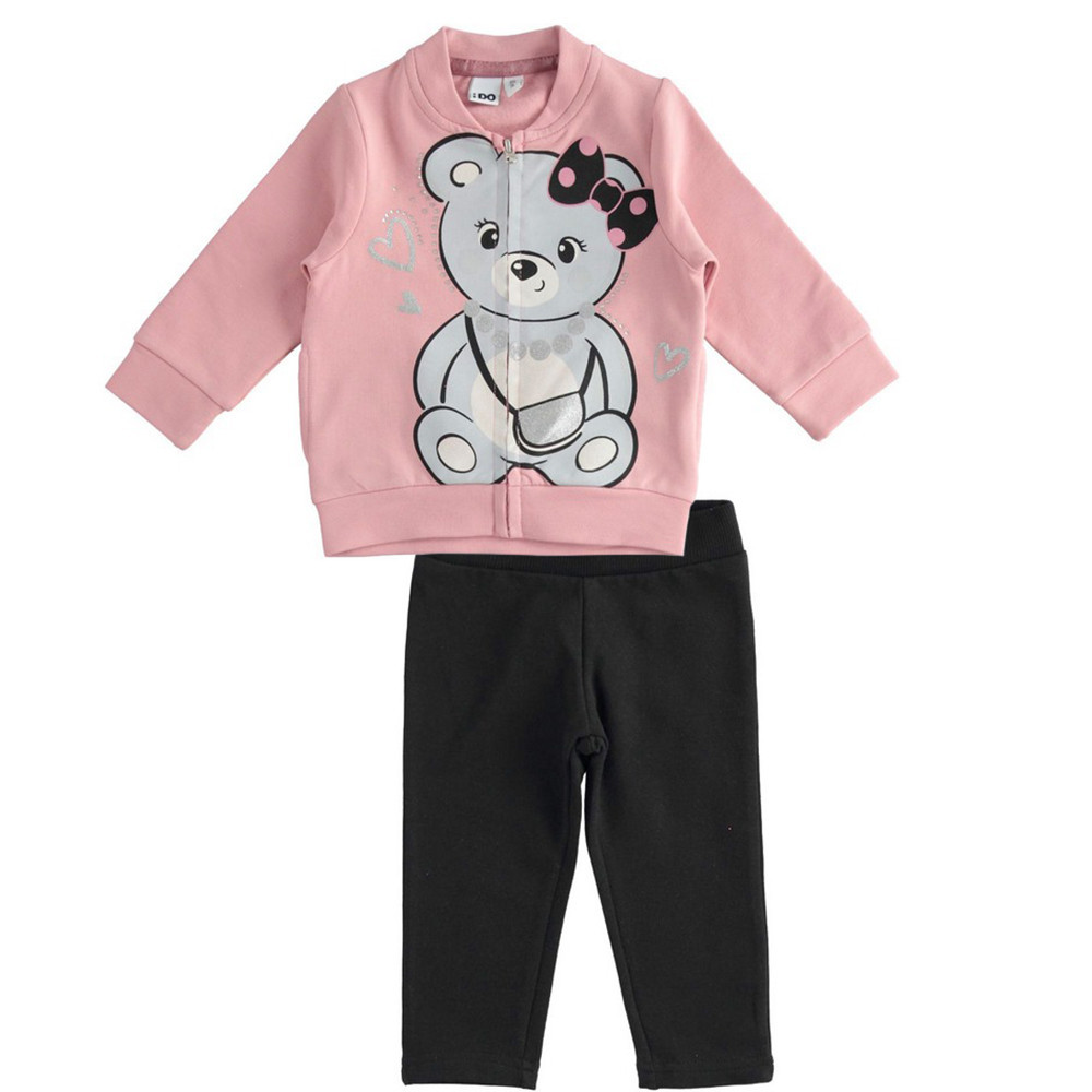 Симпатичный спортивный костюм іDO состоит из двух деталей - толстовки бомбера и штанов выполненных из трикотажного хлопкового флиса. Толстовка застегивается спереди на молнию и декорирована рисунком медведя. Эластичные брюки с прямыми штанинами, пояс на талии на двойной трикотажной резинке с внутренним шнуром, позволяющим регулировать ее объем.