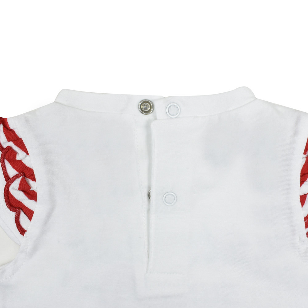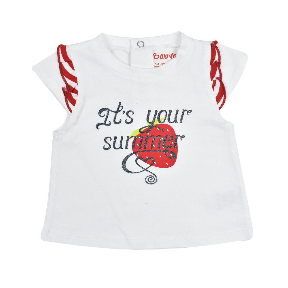 Лето не за горами. А вы подготовились к его приходу? BABYBOL предлагает замечательный стильный летний трикотажный комплект для девочки - однотонную футболку и полосатые шорты. Свободная футболка с рукавами крылышками декорированными полосатой оборкой. Перед футболки украшен принтом, на спинке застежка кнопками. Кнопки есть только для размеров до 3 лет, чтобы облегчить и ускорить процесс одевания. Трикотажные полосатые шорты с прорезными карманами спереди, пояс на талии эластичная резинка, позволяющая регулировать объем талии.