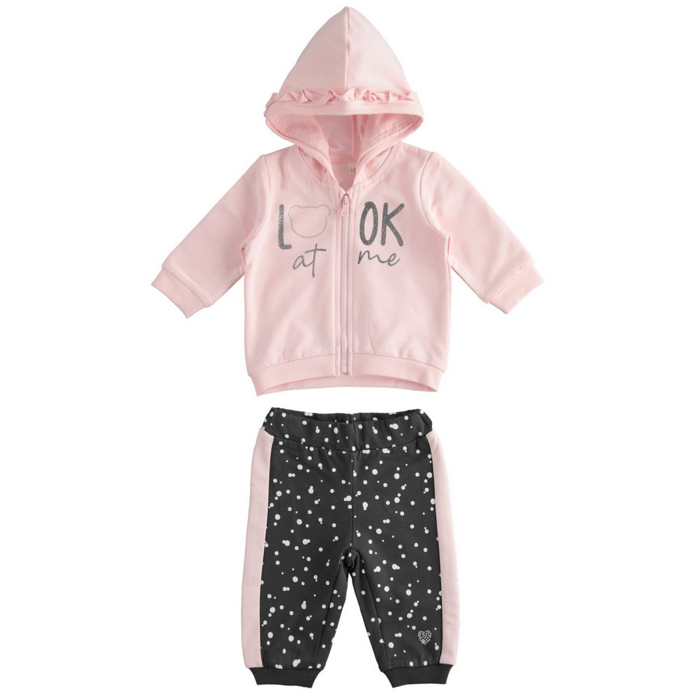 Симпатичный спортивный костюм для девочки IDO состоит из двух деталей - толстовки с капюшоном и штанов выполненных из трикотажного хлопка. Толстовка застегивается спереди на молнию и декорирована принтом, капюшон с рюшами. Эластичные штаны на манжете с сплошным принтом и однотонными боковыми вставками, декорированы сердечком со стразами внизу штанины. Пояс на талии на двойной трикотажной резинке с внутренним шнуром, позволяющим регулировать ее объем.