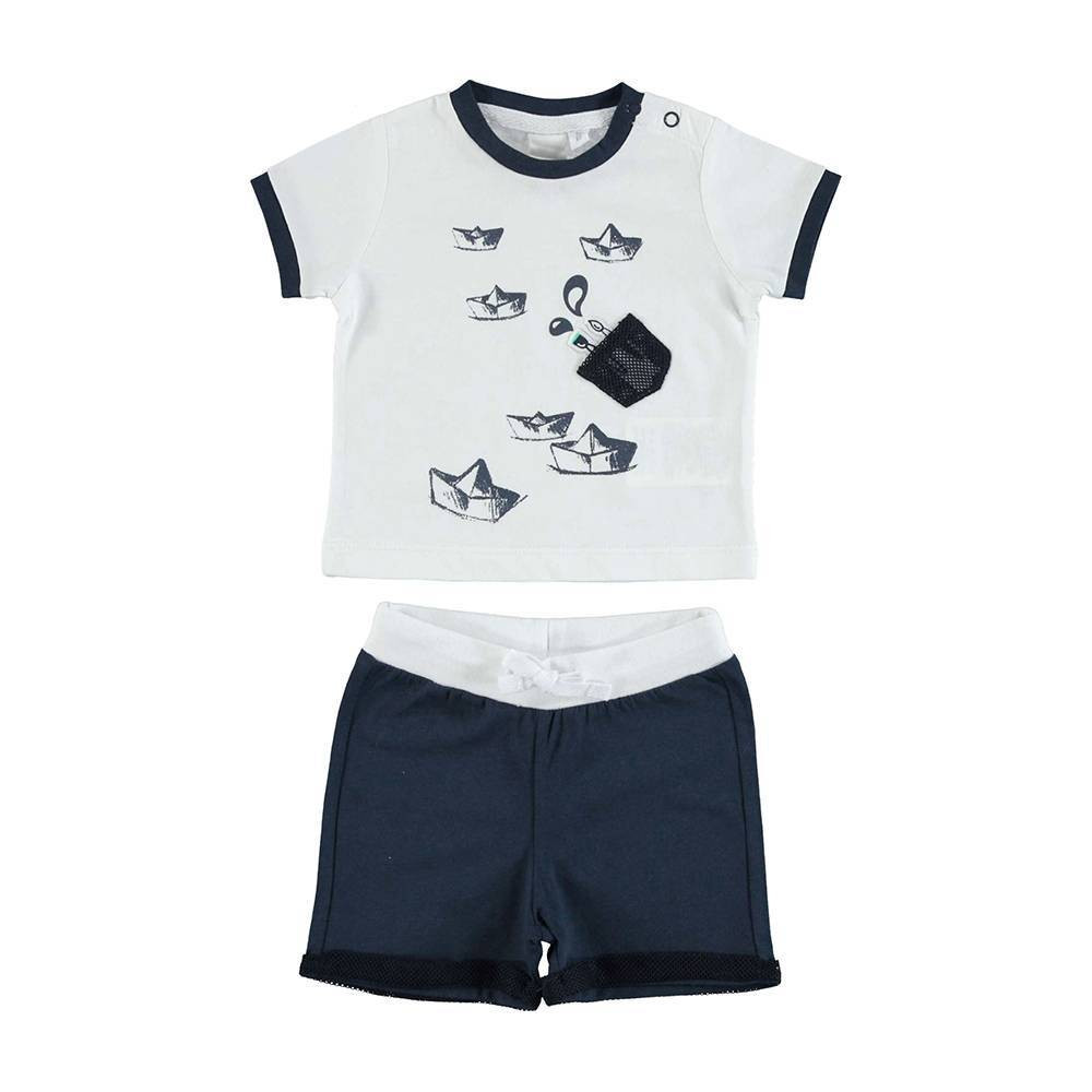 Очень милый летний трикотажный комплект iDO из 100% хлопка - футболка и шорты. На футболке спереди рисунок, на котором маленькие бумажные лодки и сетчатый карман с аппликационными кисточками, Горловина и часть рукавчика контрастная трикотажная резинка. Застегивается футболка кнопками на плече, для быстрого и удобного одевания. Контрастная трикотажная резинка с шнурком на шортах, позволяет регулировать объем талии. Снизу шорты украшают сетчатые манжеты.