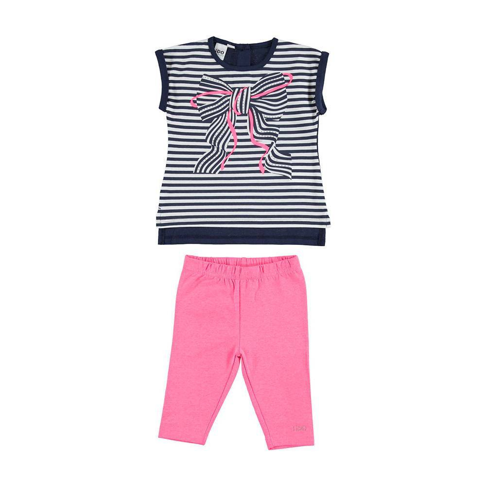Этот удобный и практичный комплект iDO идеально подходит для ребенка, когда он играет с друзьями или гуляет с мамой и папой! Наряд состоит из трикотажной футболки и леггисов. Полосатая футболка спереди и однотонная сзади пошита из 100% хлопка. Передняя часть украшена симпатичным бантом по центру и блестящими стразами и деталями, которые соответствуют цвету леггинсов. Модель для размеров до 3 лет застегивается сзади на пуговицы, в то время как для размеров от 4 лет и выше на одну пуговицу. Однотонные леггинсы длина 3/4 выполнены из эластичного трикотажа и украшены логотипом iDO в стразах.