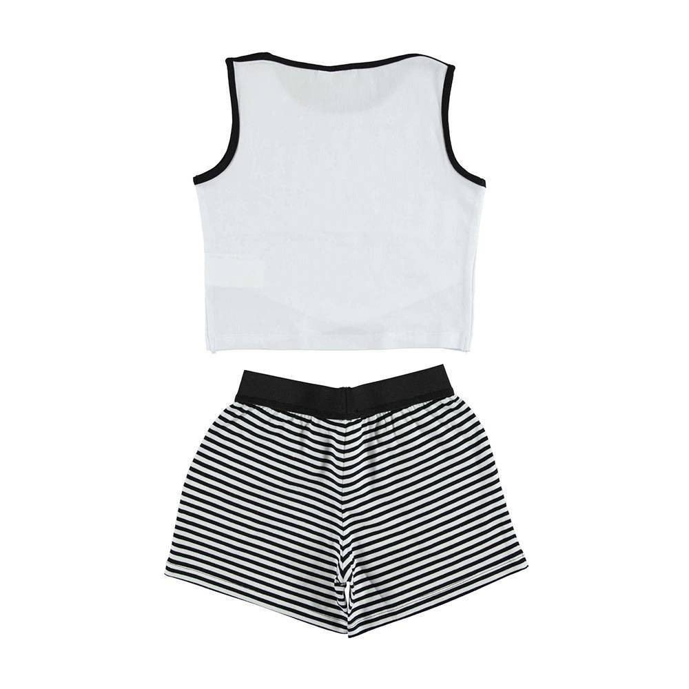 Очень красивая белая майка и полосатые шорты из 100% хлопка необходимый костюм в летнем гардеробе Вашей девушки. Горловина и пройма майки обработаны контрастной бейкой. Шорты с мягким контрастным эластичным поясом, прорезными боковыми карманами, обработаны бейкой.