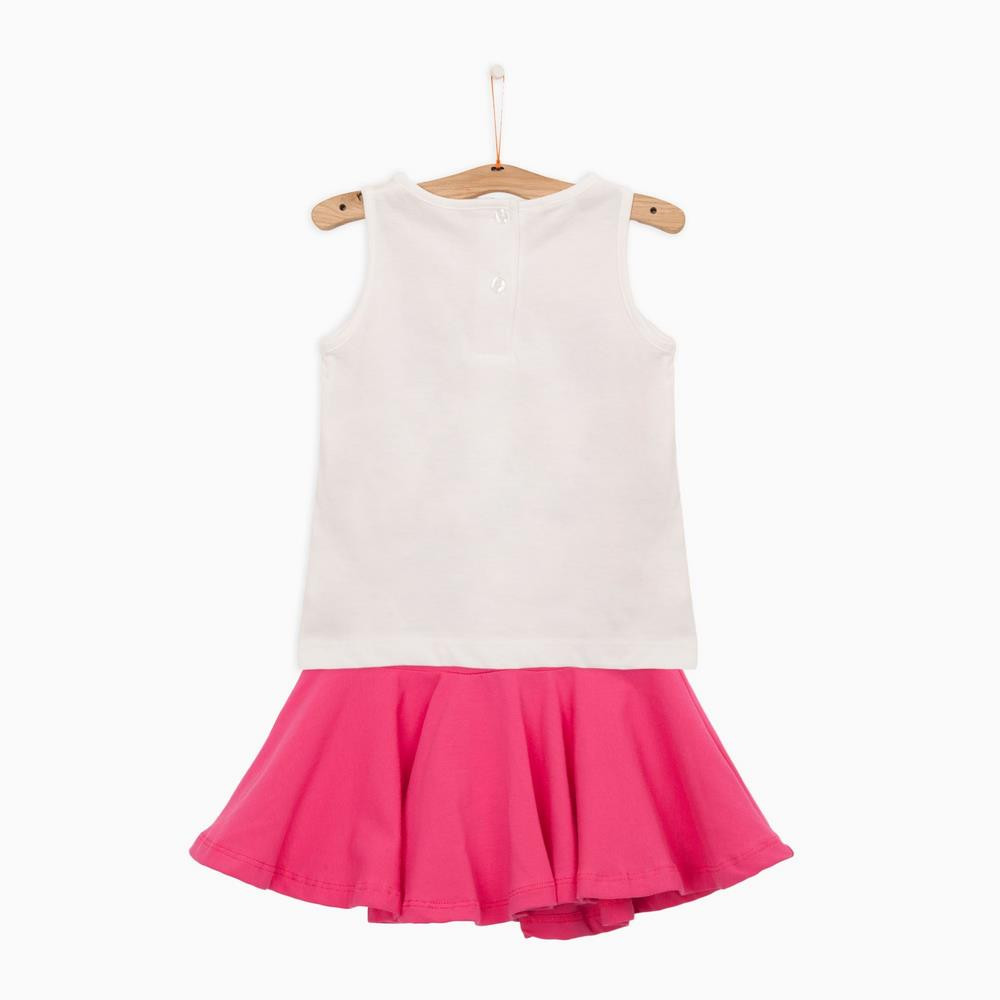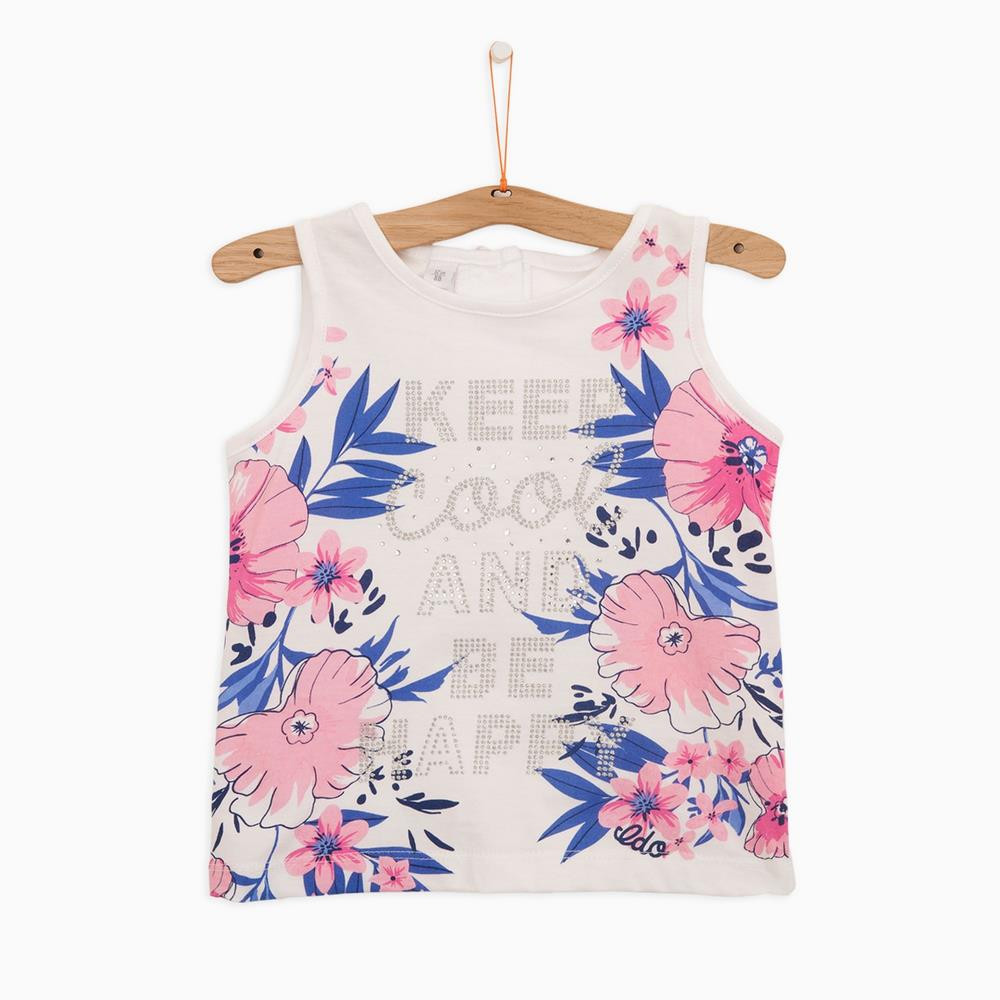 Чудесный легкий летний трикотажный комплект для девочки состоит из майки и юбки. Майка спереди декорирована цветочным принтом, застежка - 2 пуговицы на спинке. Юбка на широком поясе снизу солнце клеш.