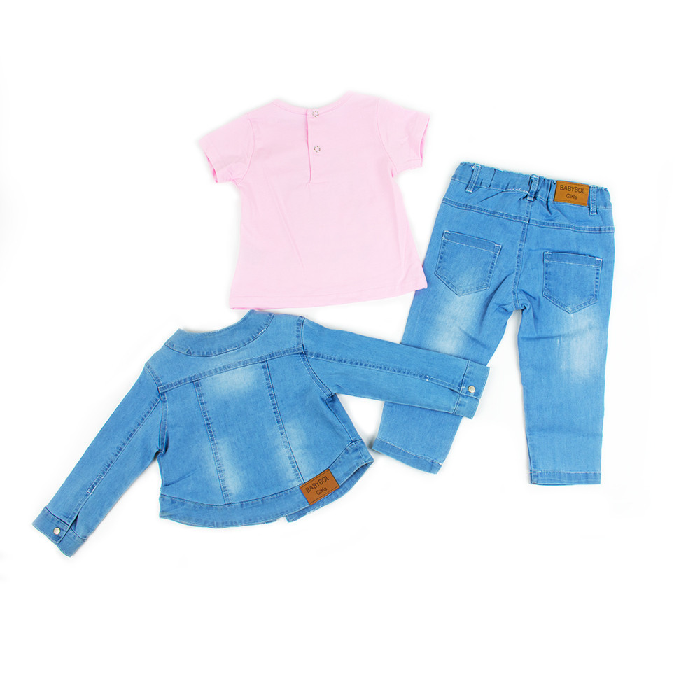 Замечательное весеннее предложение для Вашей юной модницы. Джинсовый комплект Babybol состоит из джинсовой куртки, футболки и джинсов. Стильная джинсовая куртка с потертостями декорирована вышитыми цветочками, бантом на поясе, кармашки обманки с клапаном и имитацией кнопки, отрезная кокетка на спинке. Застежка спереди по центру металлическая кнопка в виде пуговицы. Замечательная однотонная футболка спереди украшена принтом, застегивается на спинке пуговицами. Зауженные джинсы с модными потертостями. Объем на талии регулируется внутренней резинкой и пуговицей, спереди отстрочены карманы, сзади отстроченные накладные карманы. Гульфик без молнии, застежка классическая металлическая пуговица. Удобный крой и натуральная хлопковая ткань в составе делают этот комплект идеальным приобретением для весенне-летнего гардероба Вашего ребенка. Сочетайте эти джинсы, куртку с разнообразными однотонными футболками и рубашками, создавая неповторимые образы.