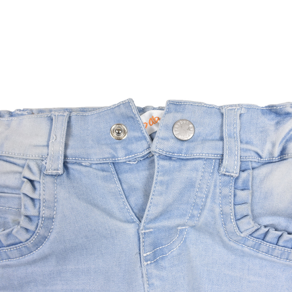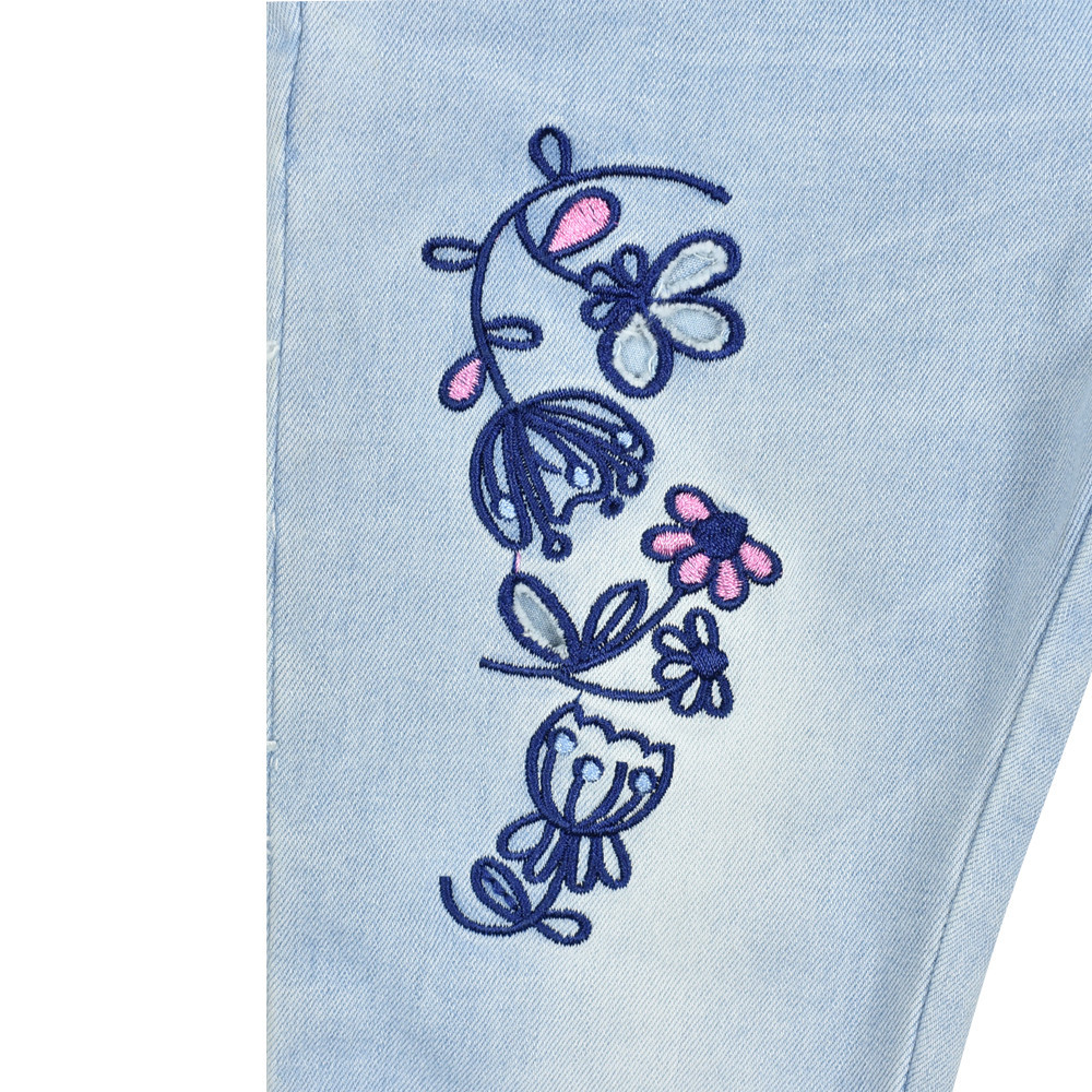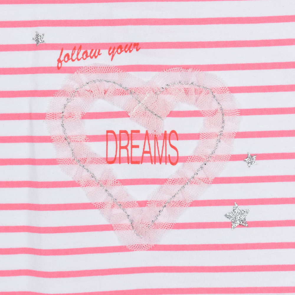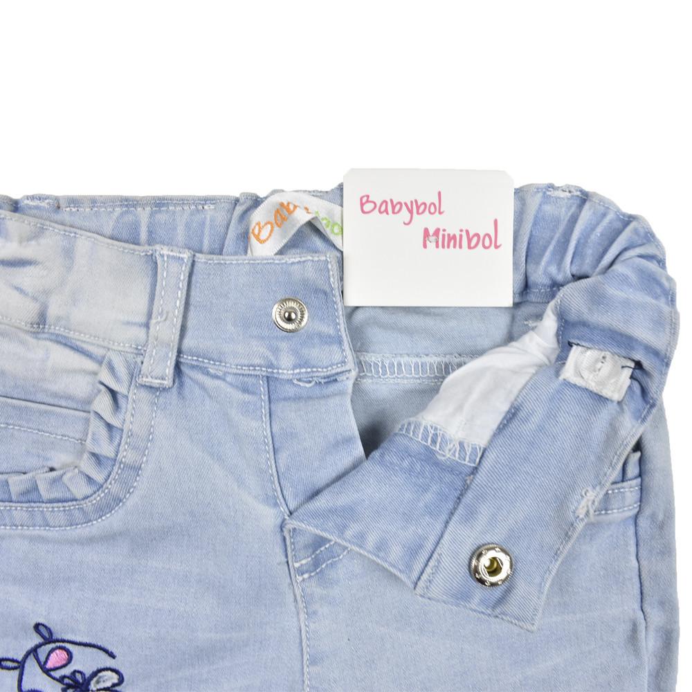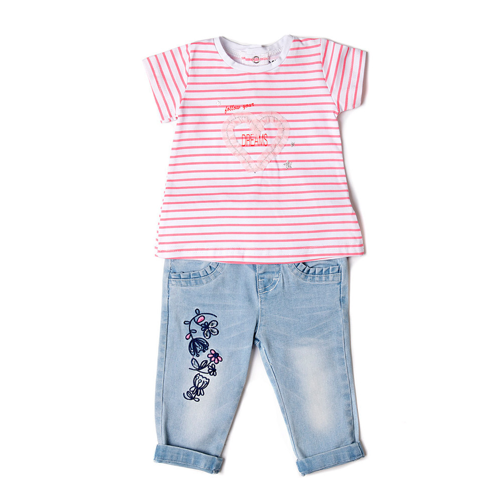 Стильный летний комплект Babybol для девочки состоит из футболки и джинсов изготовленных из хлопка. Полосатая трикотажная футболка спереди декорирован принтом в виде сердца, украшенного блестками. Застежка кнопки на спинке только для размеров до 3 лет. Джинсы с модными потертостями, карманы украшает небольшой рюш, штанину вышитая аппликация. Объем талии регулируется внутренней резинкой и пуговицей.