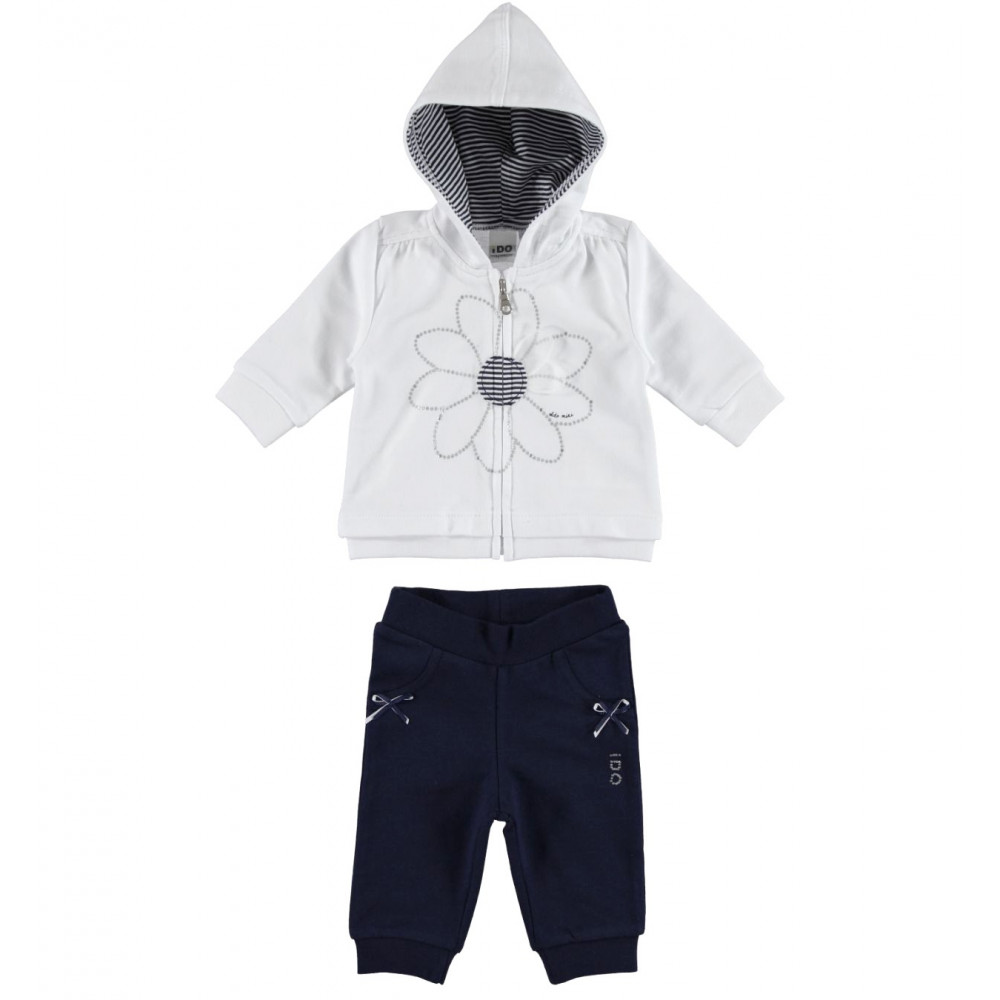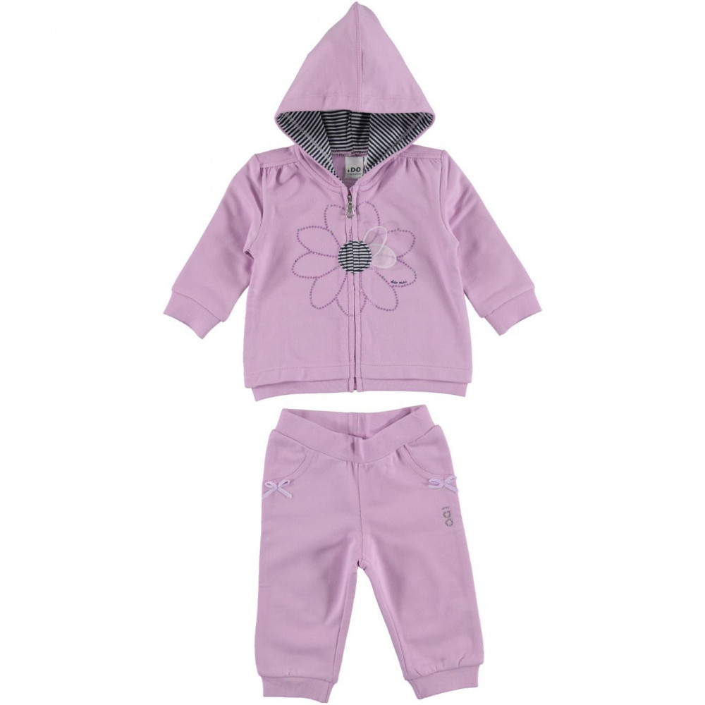Замечательный трикотажный комплект для девочки из 100% хлопка. Свитер с капюшоном, застегивается на молнию, украшен спереди рисунком цветка. Манжеты на рукавах, пояс на талии эластичная трикотажная резинка. Штанишки с манжетом на лодыжке, и украшены логотипом IDO из горных хрусталиков, и бантиками возле карманов.