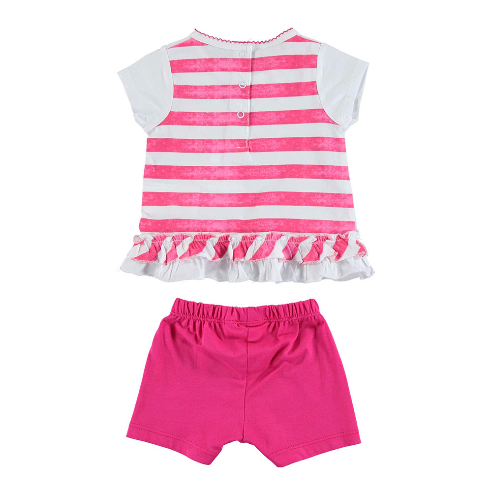 Чудесный легкий летний трикотажный комплект для девочки состоит из футболки и шорт. Футболка спереди декорирована детским принтом и аппликацией в виде цветка, спинка полосатая, низ с оборкой. Застежка кнопки на спинке. Шорты на широком эластичном поясе с боку декорированы цветной каймой.