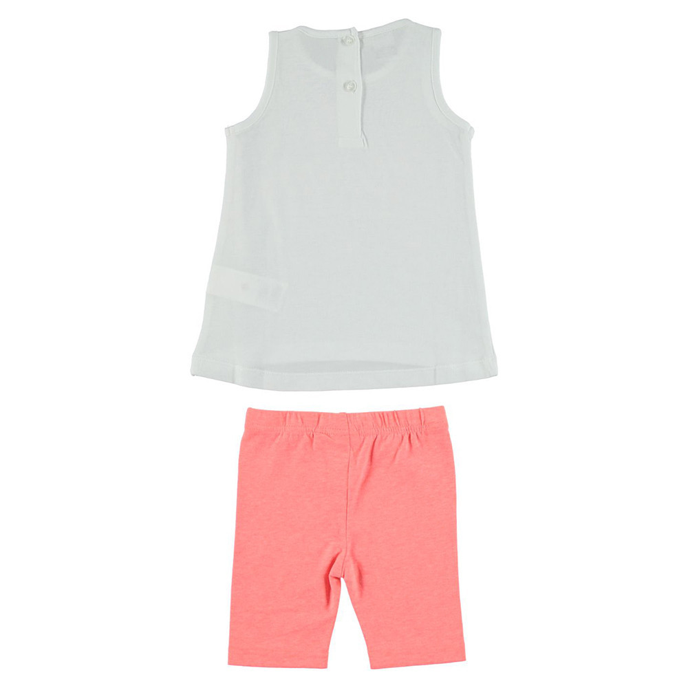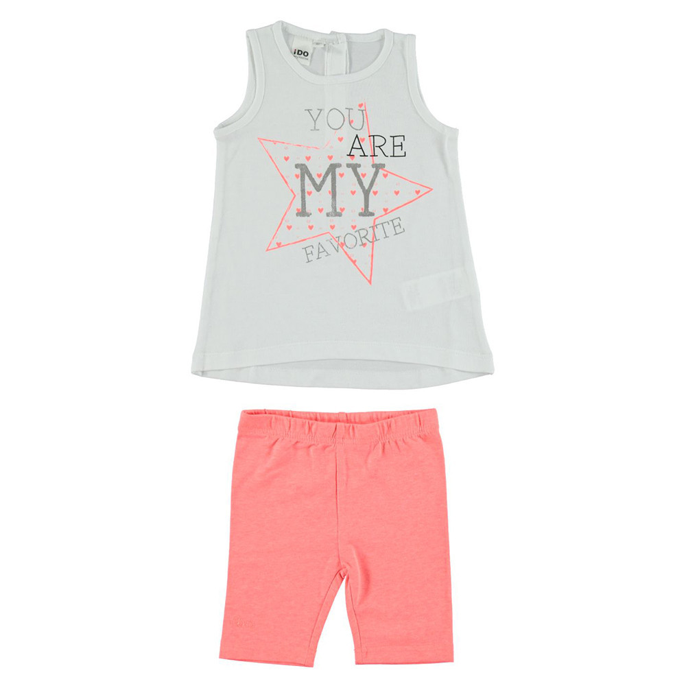 Замечательный летний трикотажный комплект - майка и шорты изготовлен из 100% хлопка. Майка декорирована печатным принтом в виде звезды украшенной стразами, расклешенная к низу, спинка длиннее переда и слегка округлена. Застежка пуговицы на спинке. Короткие шорты декорированы эмблемой IDO из стразов. Просто и не затейливо.