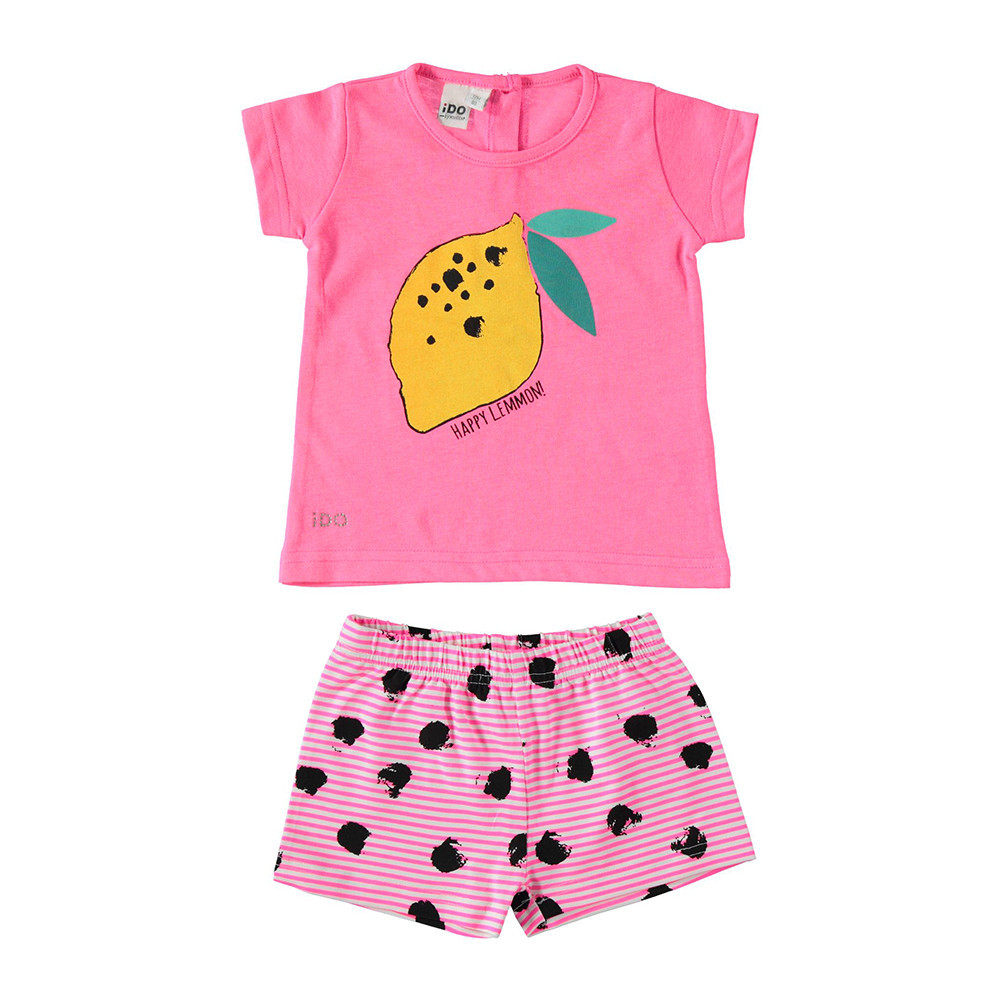 Чудесный легкий летний трикотажный комплект для девочки состоит из футболки и шорт изготовлен из 100% хлопка. Футболка спереди декорирована принтом в виде лимона, спинка слегка округлена. Застежка пуговицы на спинке.. Эластичные цветные шорты дополняют ансамбль.
