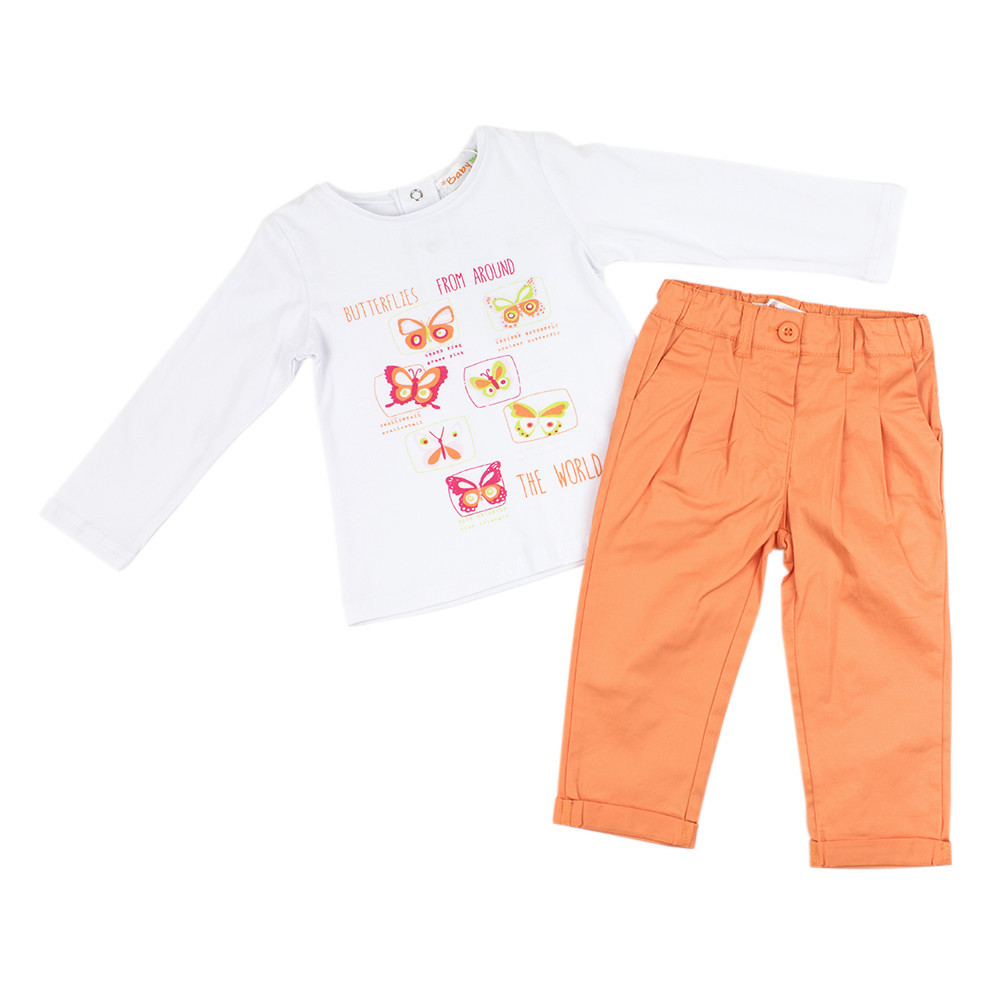 Вы готовы к приходу весны? BABYBOL предлагает замечательный комплект для девочки состоящий из реглана и тонких брюк. Комплект изготовлен из хлопка. Реглан спереди декорирован принтом, застежка кнопки на спинке, для легкого и быстрого одевания. Кнопки для размеров до 3 лет. Брюки спереди со складками и небольшими отворотами снизу, имеются боковые прорезные карманы. Пояс на талии с резинкой, что позволит регулировать ее объем.