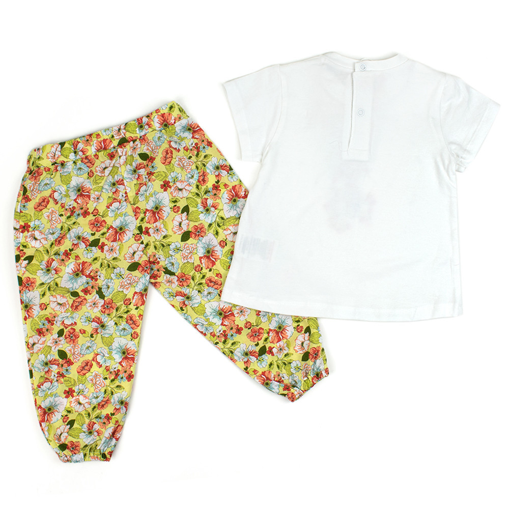 Вы готовы к приходу весны? BABYBOL предлагает замечательный комплект для девочки состоящий из футболки и цветных брюк. Комплект изготовлен из хлопка. Трикотажная футболка спереди декорирована принтом, застежка кнопки на спинке, для легкого и быстрого одевания. Кнопки только для размеров до 3 лет. Брюки спереди со складками, что придает им объем. Пояс на талии на резинке, что позволит регулировать ее объем.
