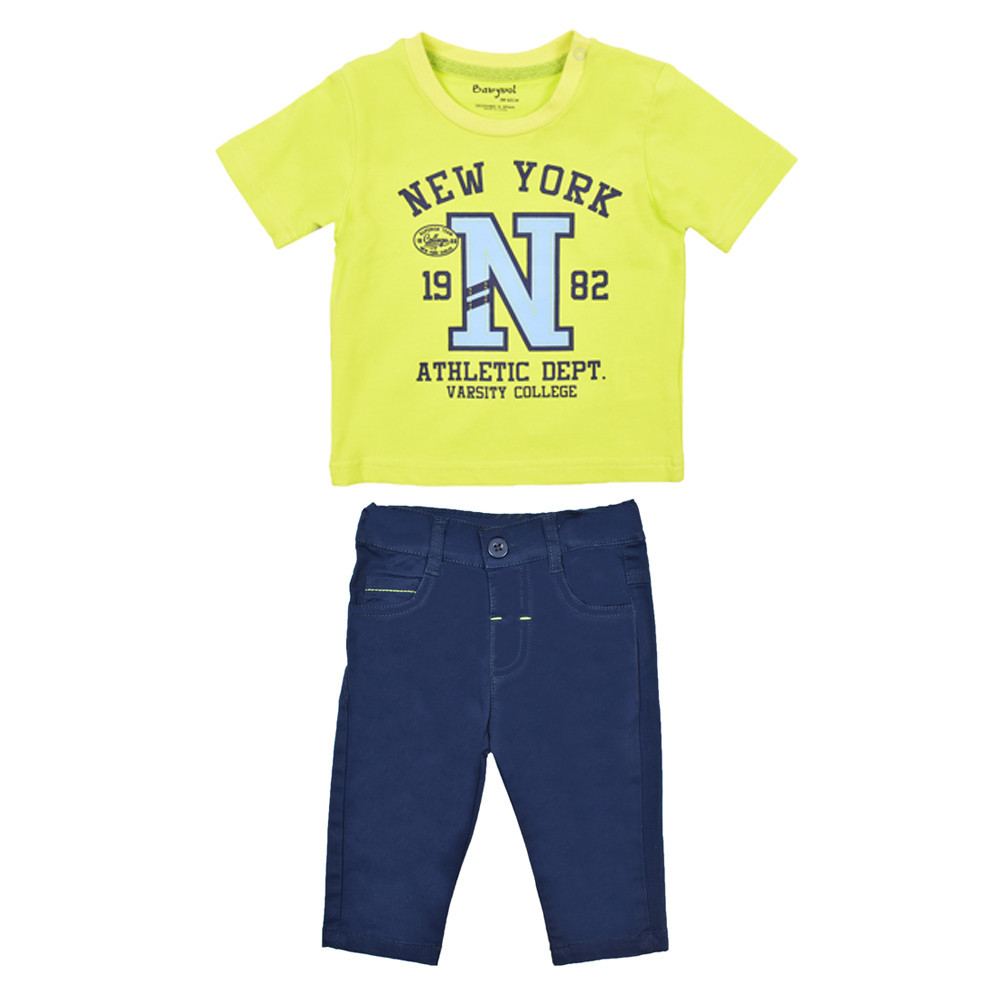Замечательный практичный комплект Babybol состоящий из футболки и брюк станет незаменимым вариантом для ежедневных прогулок. Хлопковые брюки с внутренней резинкой и пуговицей позволяют регулировать объем талии. Гульфик без молнии, застежка классическая - пуговица. Есть два передних и два накладных задних кармана. Футболка спереди декорирована контрастным печатным принтом, на плече есть кнопки для размеров от 6 месяцев до 2 лет, что облегчат и ускорят процесс одевания ребенка.